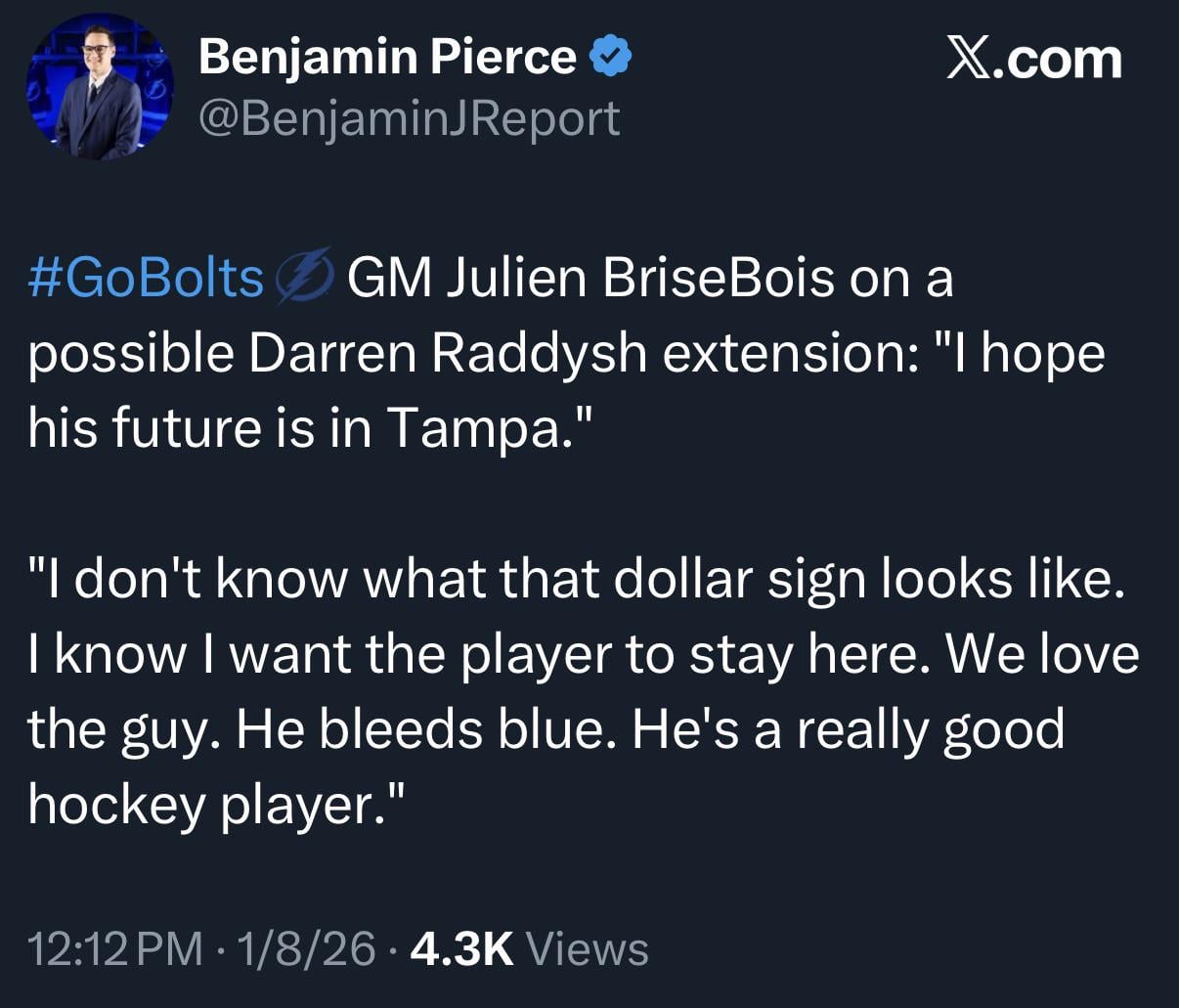 If Raddysh can get a massive payday somewhere else then obviously he should take it. I think he’s shown himself to be worth a good sum this season, but realistically he’s not an 8m a year guy. I mean, if he continues to play like he is right now, then he is. But you can’t assume that a 30-year-old player having a career season is going to continue playing at that level.