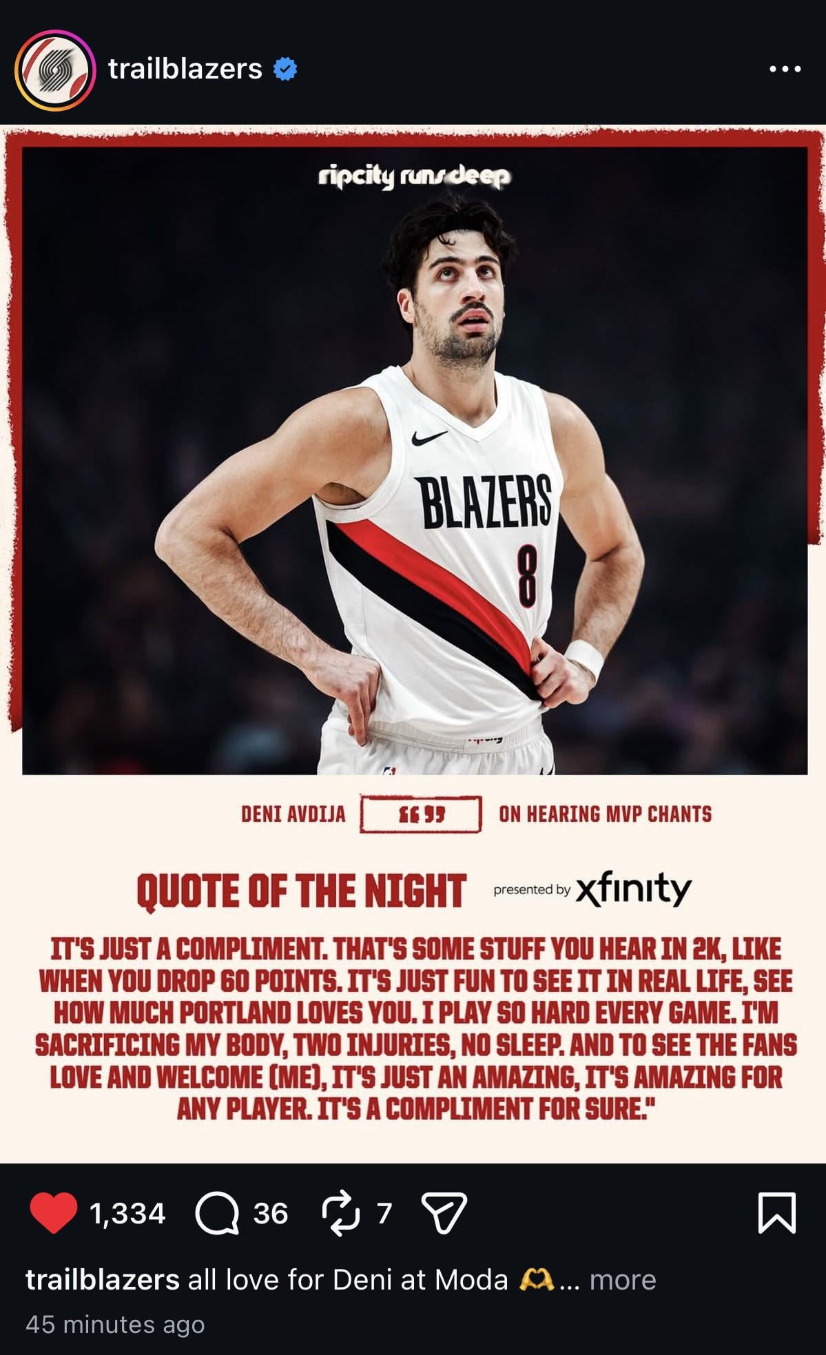 He had a play last night, think it was late third quarter, where he went down and was slow to get up, and then was trying to walk it off. Looked like an ankle tweak. A lot of players would sit the rest of the game, but Deni is a fucking iron man.