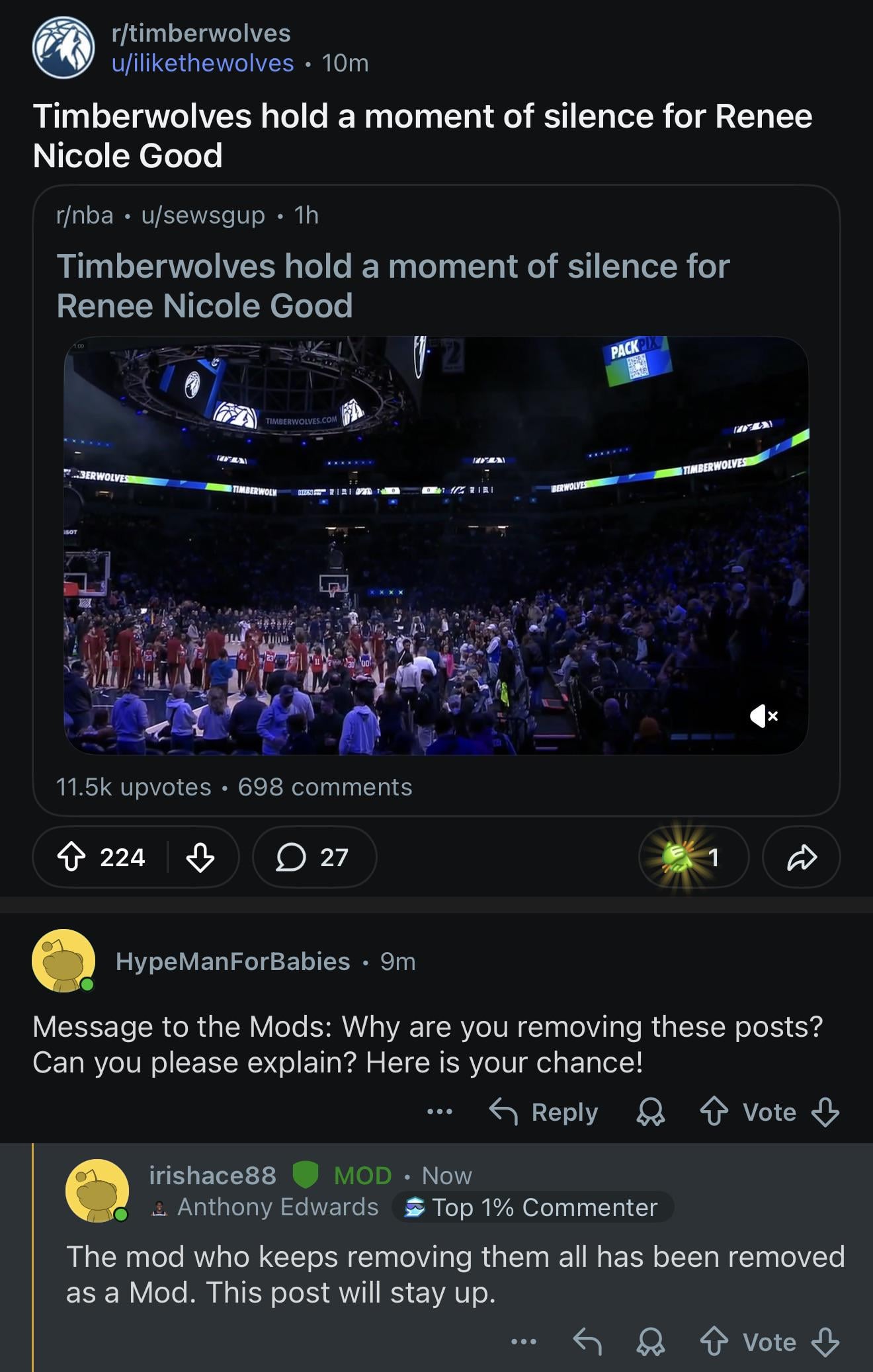 Blazer fan chiming in here just to say thoughts are with you Minny fans and residents, and massive respect to the Wolves org for recognizing Renee Nicole Good and the sub for booting that dumbfuck mod.
