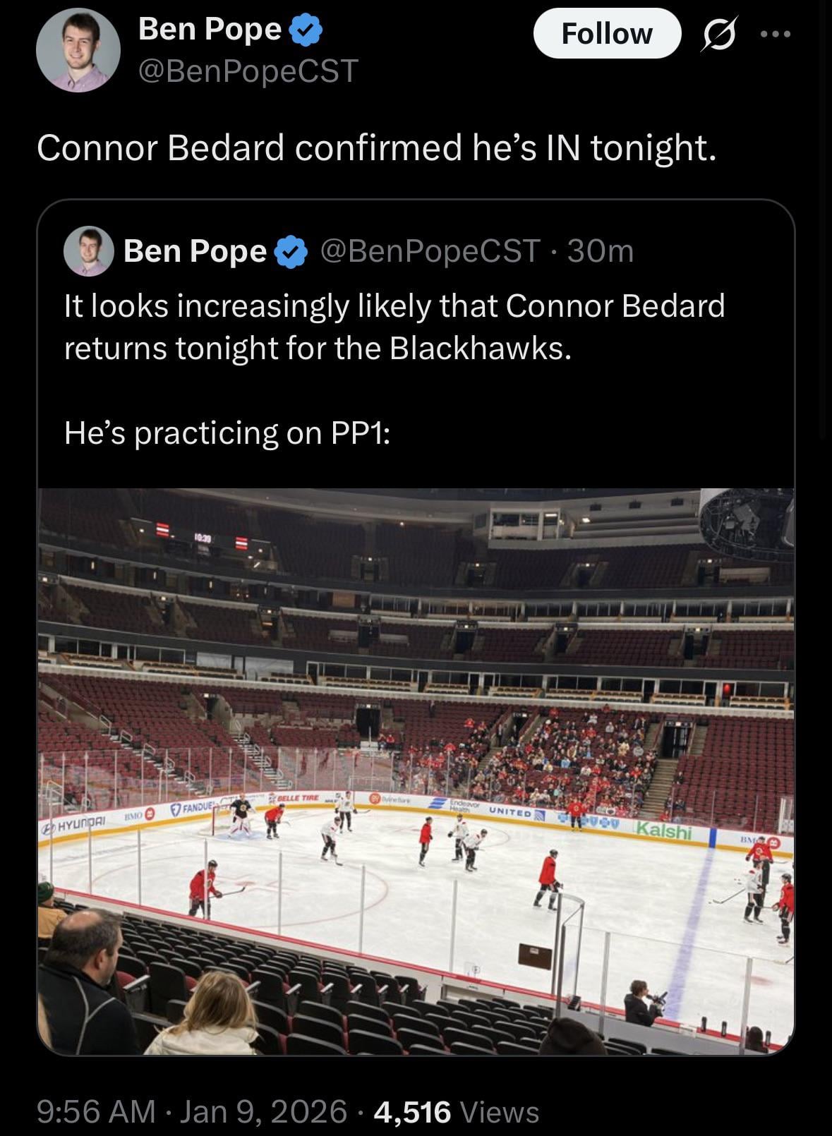 [Pope] Connor Bedard confirmed he’s IN tonight
