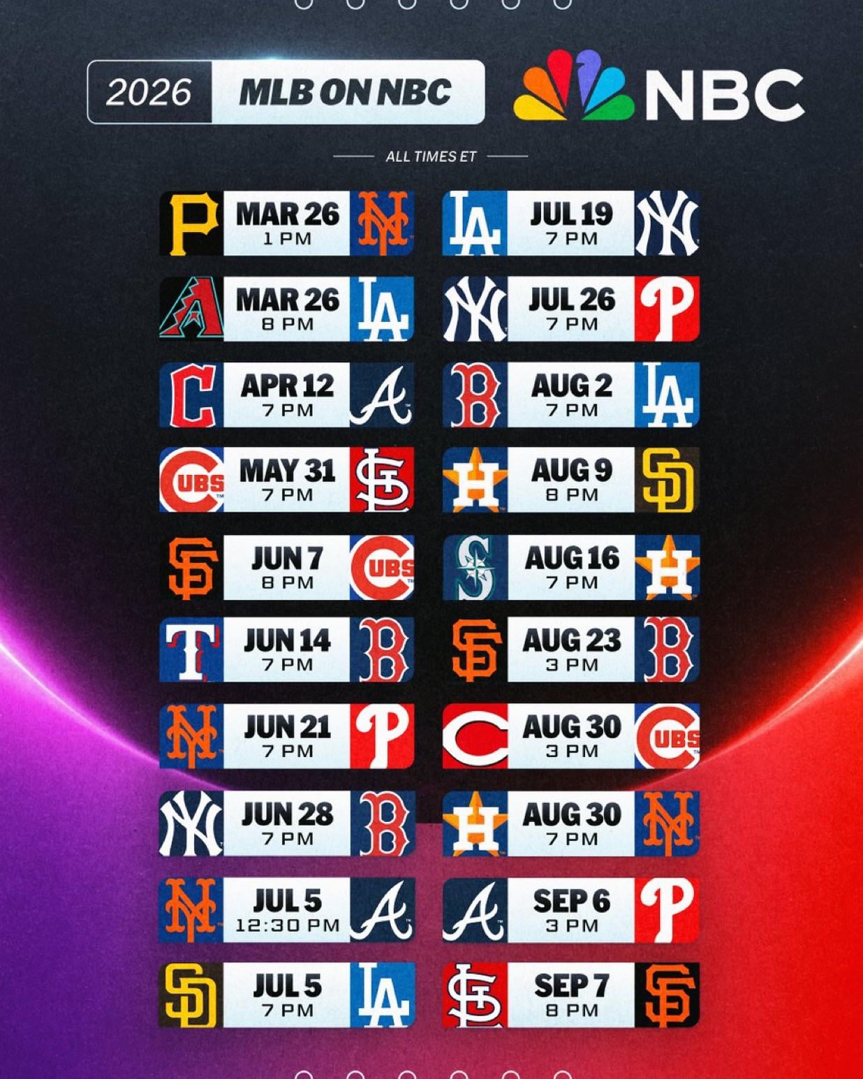 Sunday Night Baseball on NBC schedule has been released. Cards get two games.