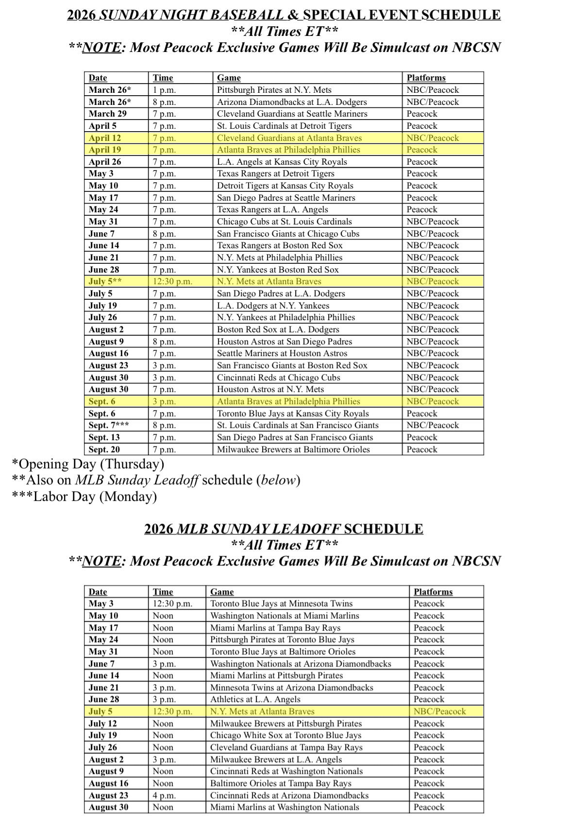 The 2026 Sunday Night Baseball and Sunday Leadoff schedules have been released.