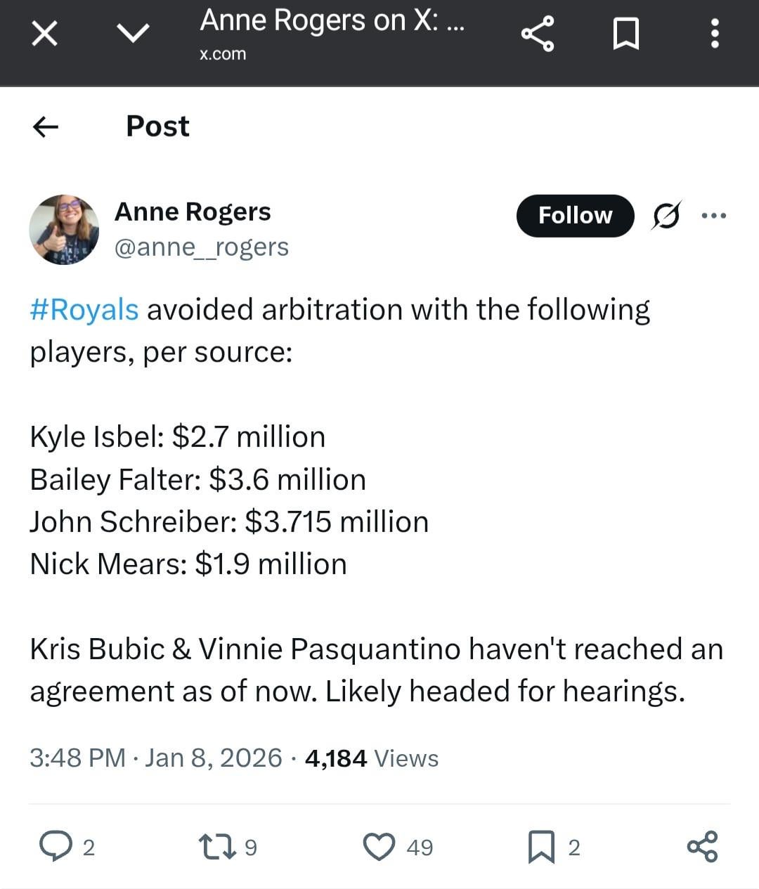 [Anne Rogers] #Royals avoided arbitration with the following players, per source: Kyle Isbel: $2.7 million; Bailey Falter: $3.6 million; John Schreiber: $3.715 million; and Nick Mears: $1.9 million. Kris Bubic & Vinnie Pasquantino haven’t reached an agreement as of now. Likely headed for hearings.
