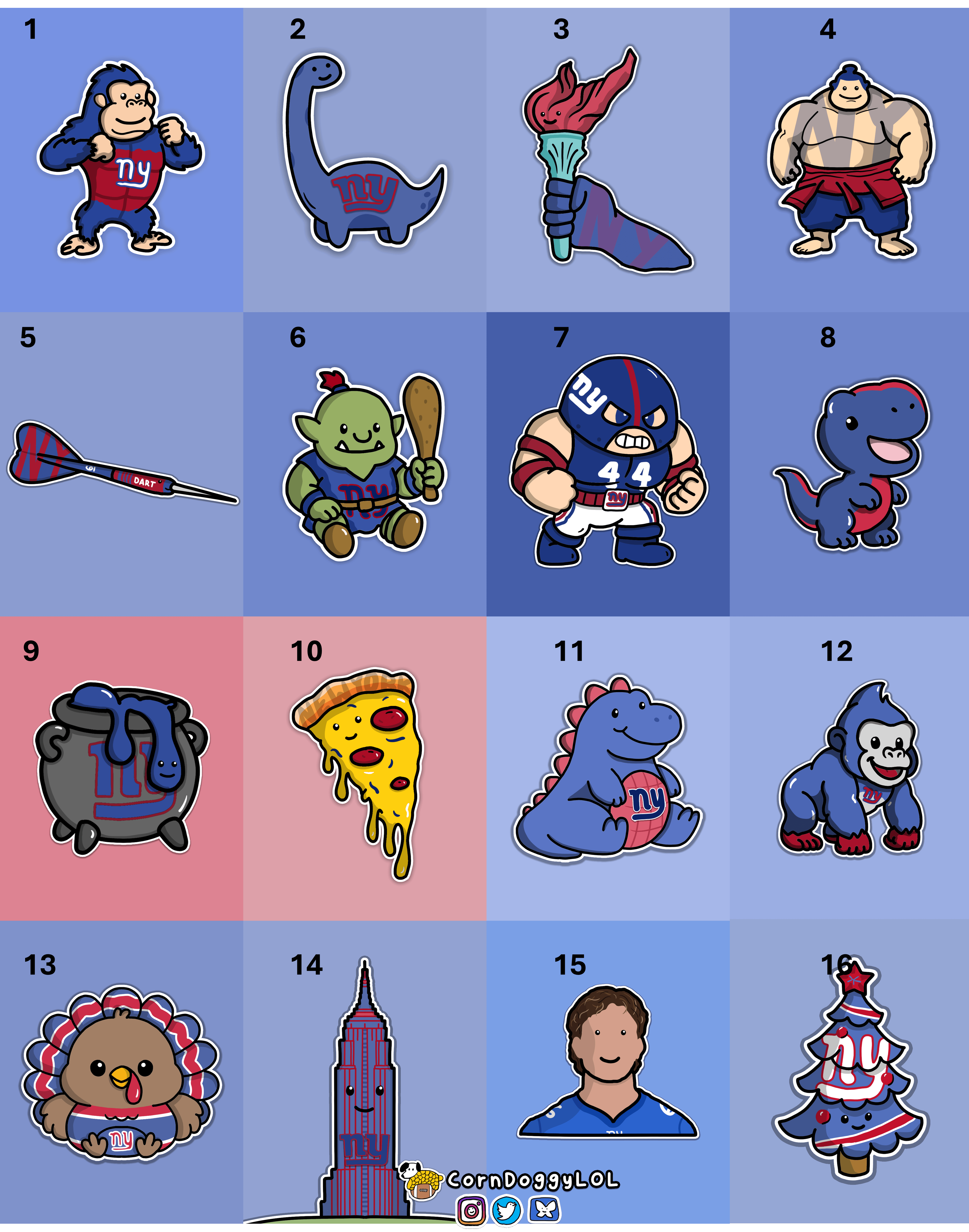 The 2025 New York Giants Doodles π Do You Have A Favorite? 50 comments 7 1 Was there a rat one? Or am I misremembering 7  7 indeed 2,7, and 8!! All great though 7 is pretty awesome, but donβt sleep on 5. 13 7 7 easily 7,14,13,15 in order. Nice job! Any of the Dino ones, but specifically 8. 7, 2, 15 Another killer season by you, my friend. 6 and 9. Nice. 7! 7 10, 7 7 My faves are Juggernaut Skat and the happy T-Rex 7/11 7 & 11 I’m very partial to #2 but #7 is probably the most accurate 7 Is #4 G. Honda 7 Hell yes. 7 I would LOVE #7 as an iPhone wallpaper 5 Juggernaut… Juggerboo… Skaternaut 7, 8, 12 Love 13 and 16! Why pizza 7 7! 7 reminds me of Skattebo 15 7 ally day, especially on sundays. All of them are so cute, but I think 11 is my fave. Thanks for doing these!! 8 2. Then 6. The witch’s brew ooze fondly reminds me of the slimes, from Dragon Warrior/Quest,…but…I’m going to have to go with Bronto Buddy (#2) as my top choice. They are all great. I kind of like number 2. π 7 But I like the dinosaurs, especially 11. 16,12,7 7 1 6 π 1 and 7 . Well done. 2,7,14  Leave a ReplyYou must be logged in to post a comment.