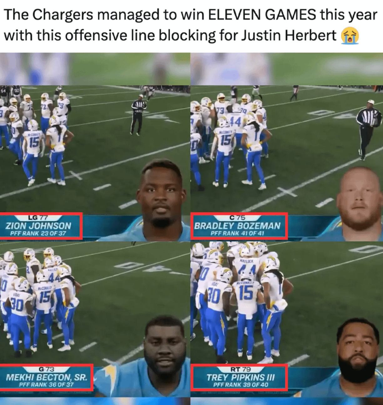 Yeah, their patched-together offensive line is UFL quality. Herbert should get credit for just surviving.