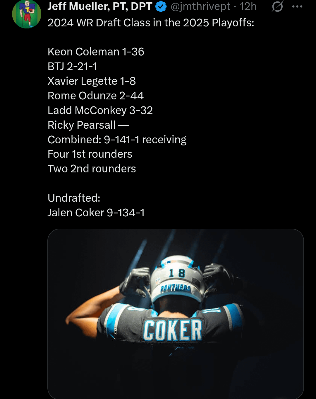 It really doesn’t get talked about enough how bad that 2024 WR class looks relative to expectation after 2 full years of games. Like, it was the greatest class ever. It was 2020 but better. It was come get your future All-Pro game breaking WR1. None of them (outside of XL and Coleman) are objectively bad players, but they’re all just fine. Just a bunch of WR2s that aren’t really anything particularly special. I find it particularly amusing in hindsight how people were trashing the 2025 class as “not even close bro, last year was the year to get your WR, McMillan would be like WR8 if he came in 2024.” If I had a draft class with all of them available to me, I would legitimately draft all 4 of the top receivers from 2025 (Tet, Egbuka, Burden and Golden) before I would think about 24 receiver. And then the first receiver I would take would be fucking Ladd.