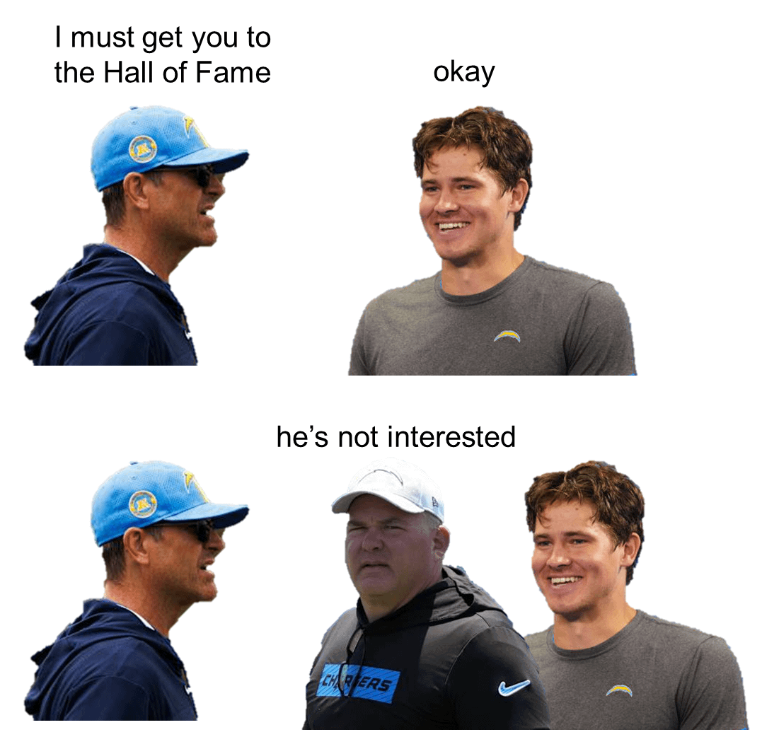 Craziest thing to me was when Harbaugh said in his first opening presser “Justin Herbert deserves an All Star coaching staff on offense” and proceeded to hire his ‘ol drinking buddies Greg Roman, Mike Devlin and Marcus Brady.