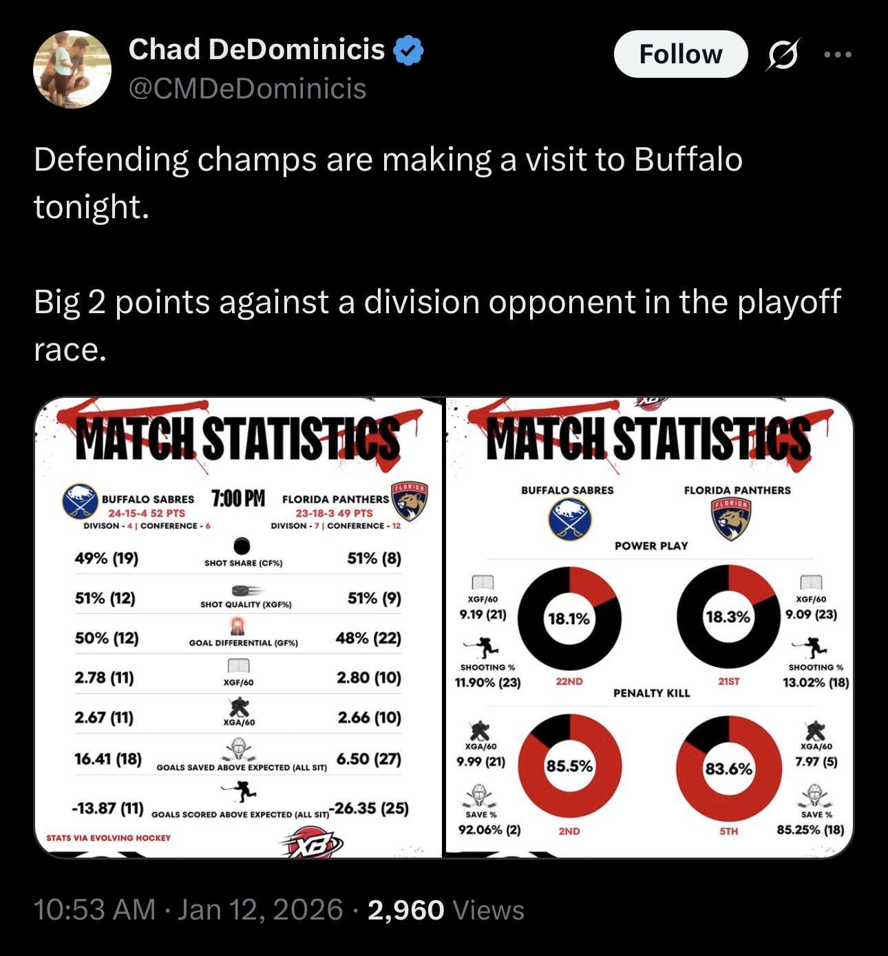[Chad DeDominicis] Defending champs are making a visit to Buffalo tonight. Big 2 points against a division opponent in the playoff race. 6 comments https://pbs.twimg.com/media/G-eXMvpXIAAcJyo?format=jpg&name=large https://pbs.twimg.com/media/G-eXMvvWIAAp8kQ?format=jpg&name=large Here comes the dirty Why does it look like he smeared blood across the top of the graphic Please no elbows, blind punches or boarding. buckle up for no PP goals tonight Tonight the KBC is the Krebs-Beck Colosseum. Hit them first. Leave a ReplyYou must be logged in to post a comment.