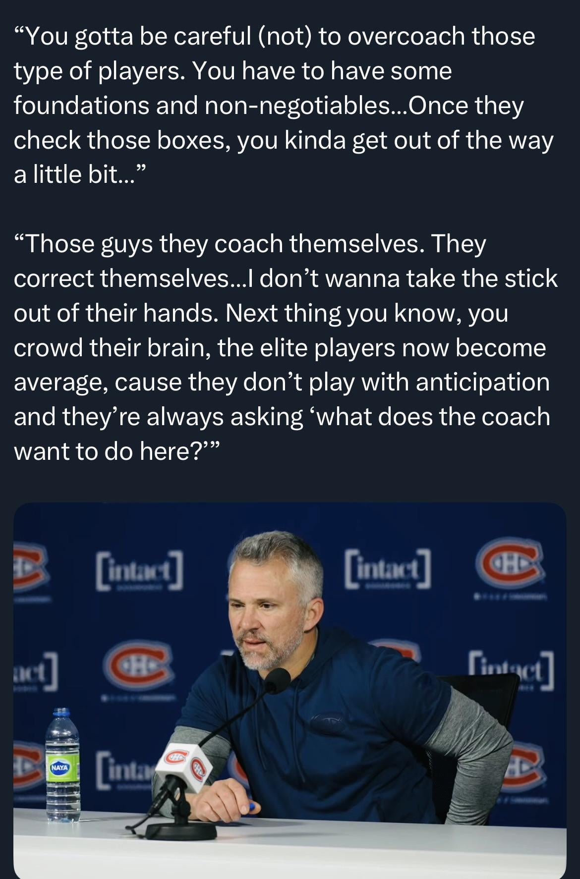 Its quite possible that with the pure offensive type guys, trying to make them 2 way players and always be in position.. they lose some creativity and are less willing to be creative and use skill with fear getting out of position or benched or scratched. Definitely could be part of the reason we see our team be boring not creative not fast not scoring goals. Im sure theres a fine line between too defensive too structure and too lose to free!. Gotta find that balance and allow the creative guys to use their skill