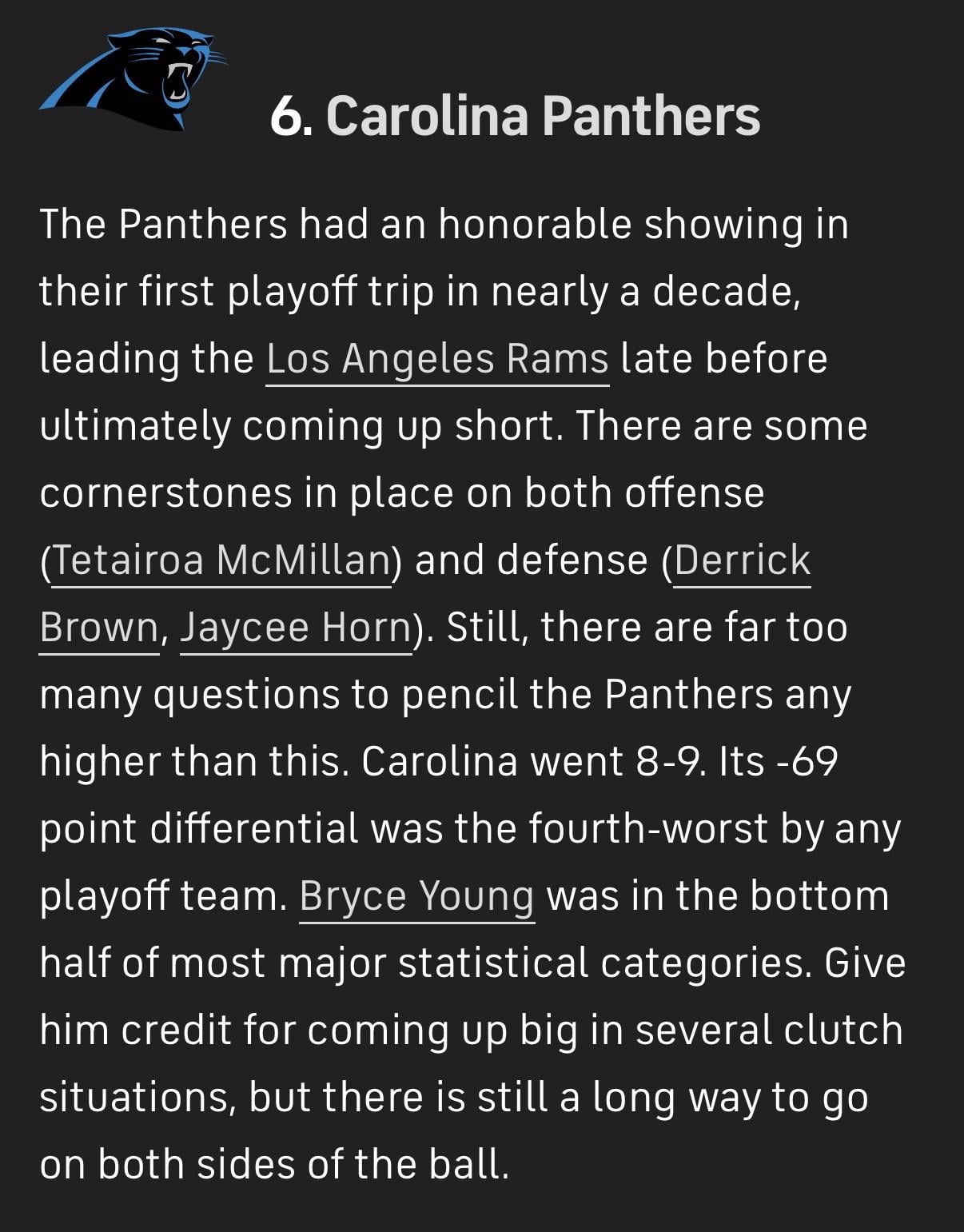 Higher than 6? I’m happy we’re this high. I don’t think any Panthers fan would really agree with any of this. There’s a lot to be optimistic about, but also a lot of shaky aspects of our game that we need to tighten up.