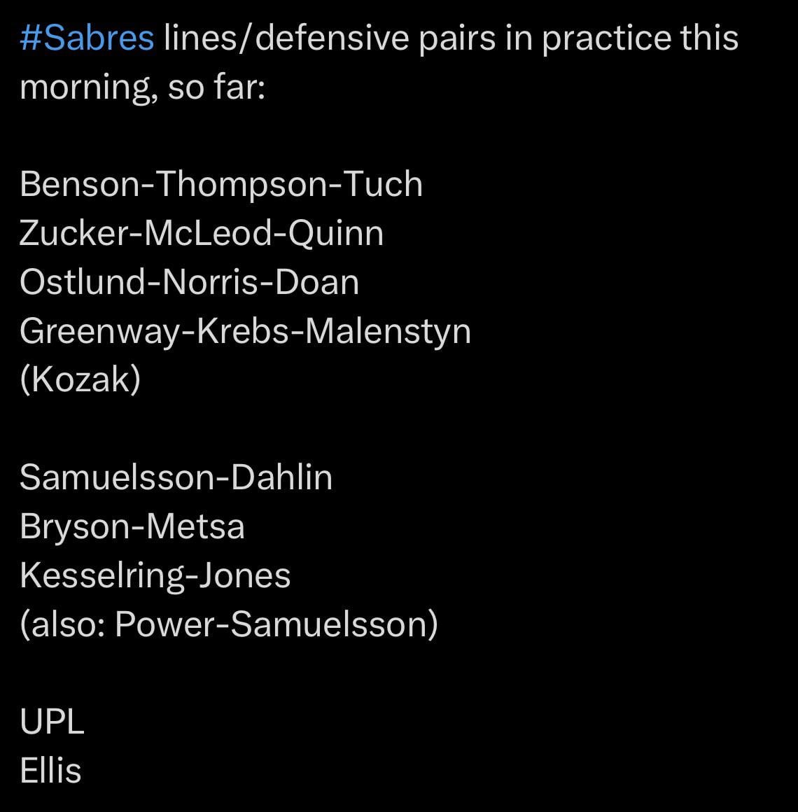 Not as bad as they have been. Would like to see Zucker with Thompson and Doan, Norris, Tuch, and Benson, Ostlund, McLeod and Quinn and don’t mind that 4th line.