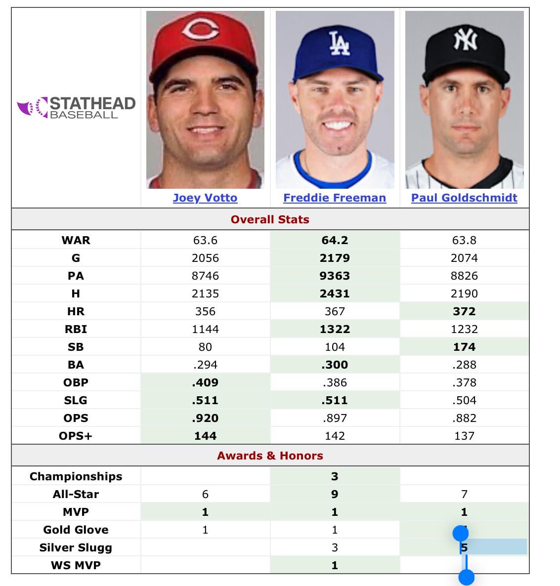 Freeman is 2 years younger than Goldschmidt and Votto is done accumulating stats. Freeman is already in the lead on most counting stats and accumulated WAR. That gap will likely grow with freeman having more productive years left. When all their careers are all over, Freeman will be the clear pick.