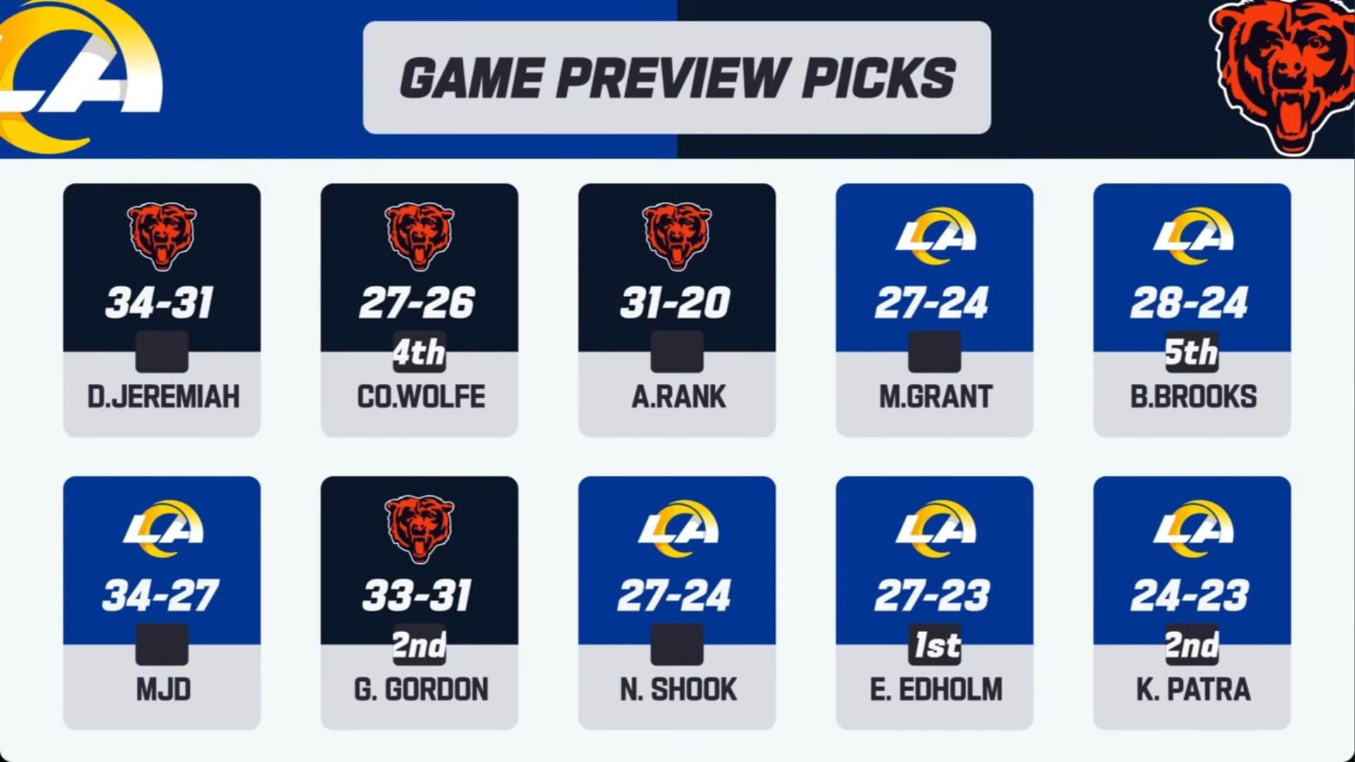 1. I can respect the close losses to the bears predictions, but Rams only scoring 20 is such a horrible guess.