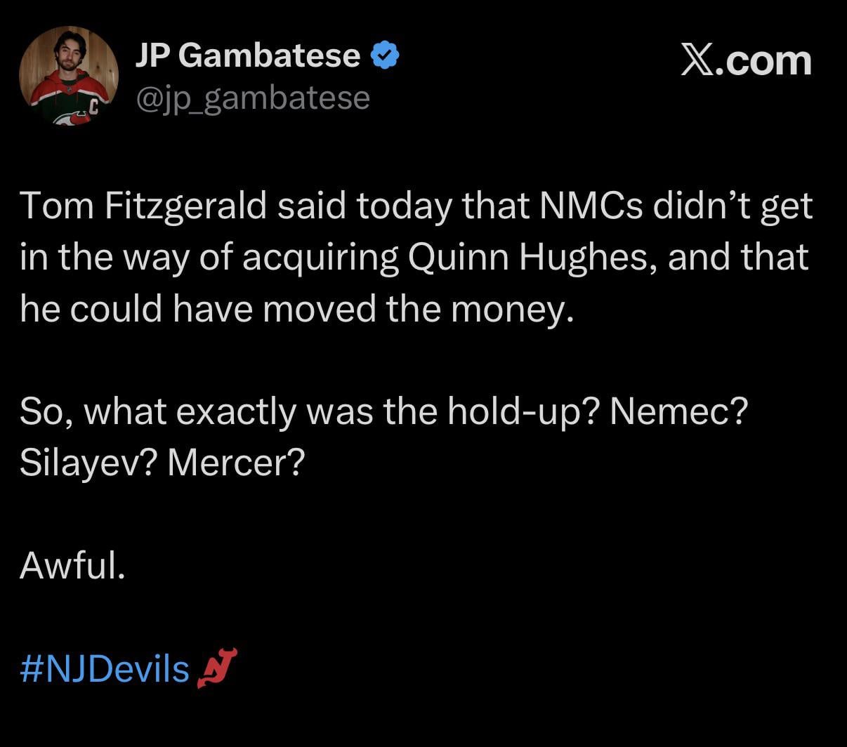 [Gambatese] Tom Fitzgerald said today that NMCs didn’t get in the way of acquiring Quinn Hughes, and that he could have moved the money. So, what exactly was the hold-up? Nemec? Silayev? Mercer? Awful.