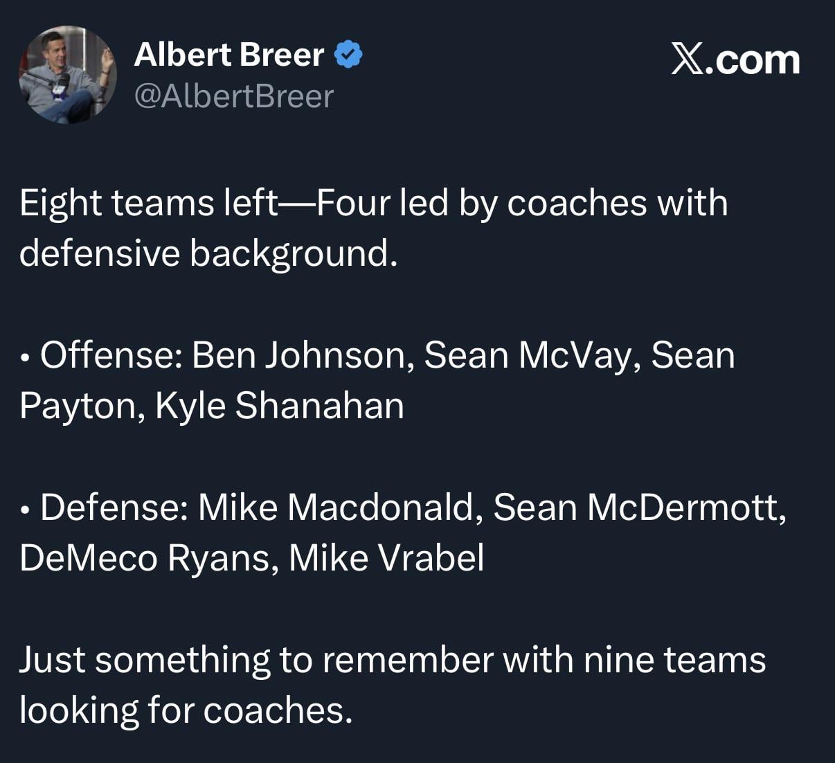 Only reasons I’d want offensive head coaches over defensive is so they can focus on the growth of a rookie QB and have continuity on offense for the foreseeable future. I do not want a situation like Carr where Mendoza has to learn a new playbook/system every 1-2 years.