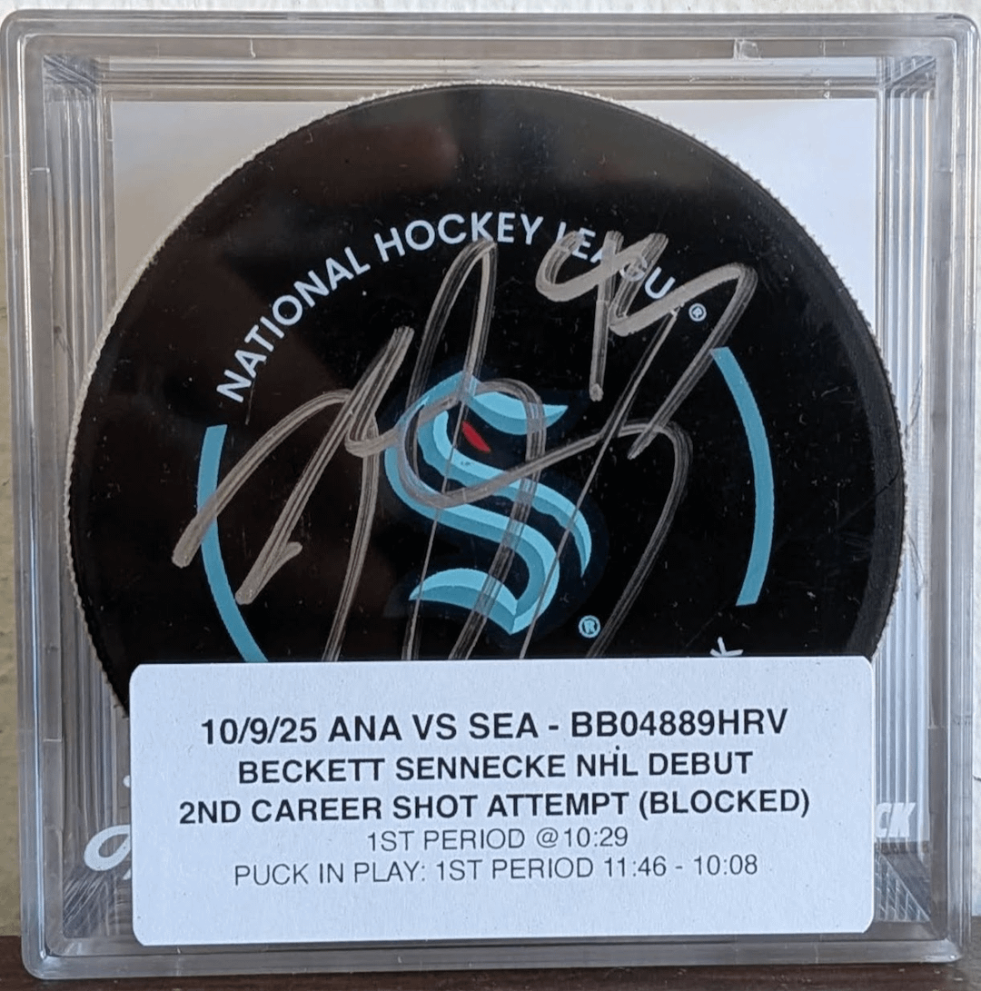 Beckett Sennecke NHL debut game used puck and signed! This was the puck for his debut game on Oct 9th 2025 vs Kraken, he had his 2nd career shot with this puck (blocked).