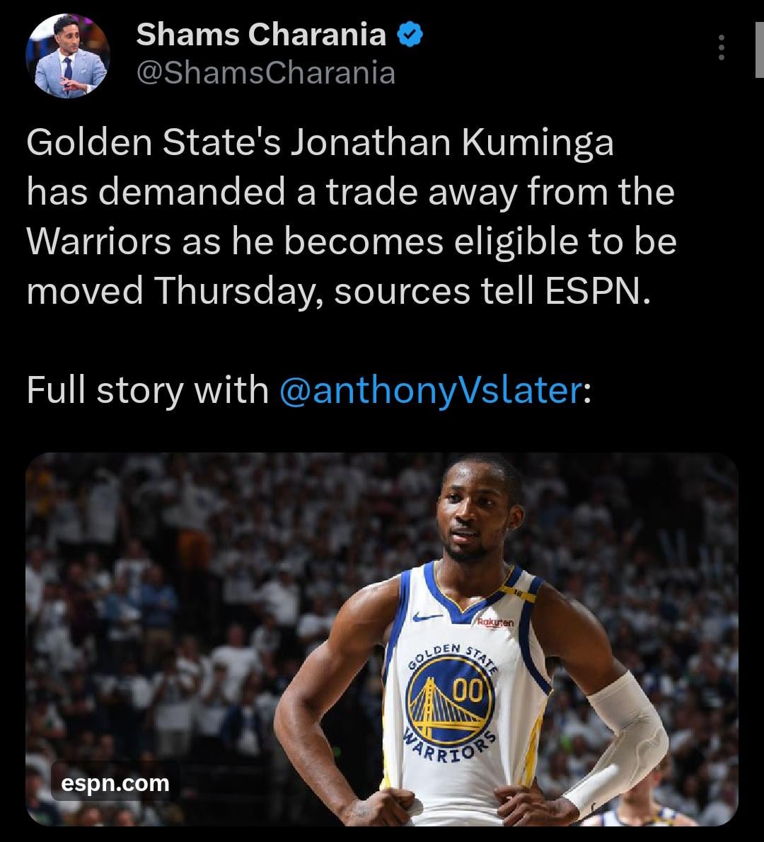 Golden State’s Jonathan Kuminga has demanded a trade away from the Warriors as he becomes eligible to be moved Thursday, sources tell ESPN.