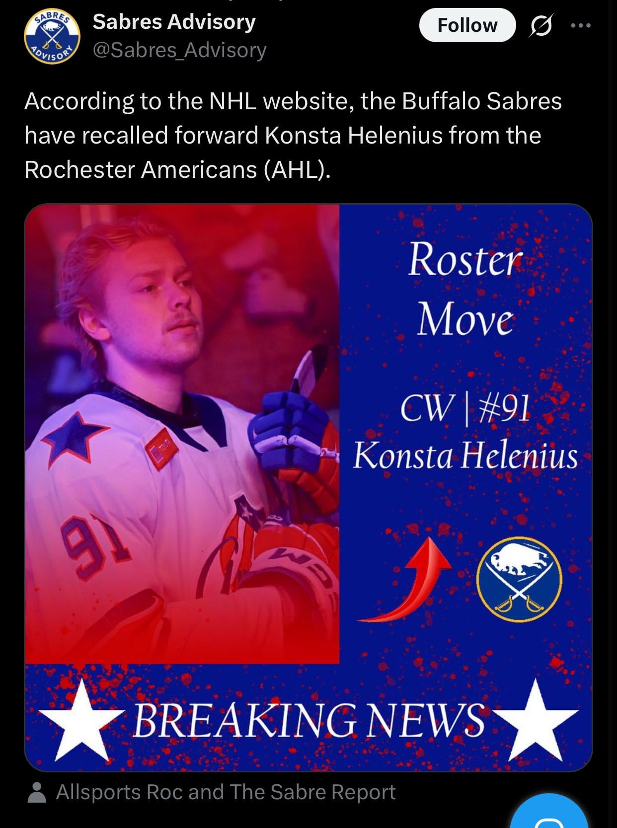 [Sabres Advisory] According to the NHL website, the Buffalo Sabres have recalled forward Konsta Helenius from the Rochester Americans (AHL). 10 comments  Maybe the news for Norris isn’t the best. Also of note, Helenius has passed Rosen in the depth chart. Likely filling in for Norris, who I hope is ok and nothing major. Konsta is exciting tho and Im happy to see what he can do. He’s gonna make his case to stay off this one game tonight maybe with a hat trick Loved his game in the few chances I got to watch him in ROC. Hope Norris isn’t too bad https://preview.redd.it/9l1d6cf0zkdg1.png?width=1080&format=png&auto=webp&s=48af2ce21cfef59b85a9331314247b4bc38985c4 The time is now!!! I love this. Norris is a great player but damn he had bad luck with injuries and bones are made of glass. Does this mean be may be playing tonight? Would be weird to call him up and not have him play right?  Leave a ReplyYou must be logged in to post a comment.