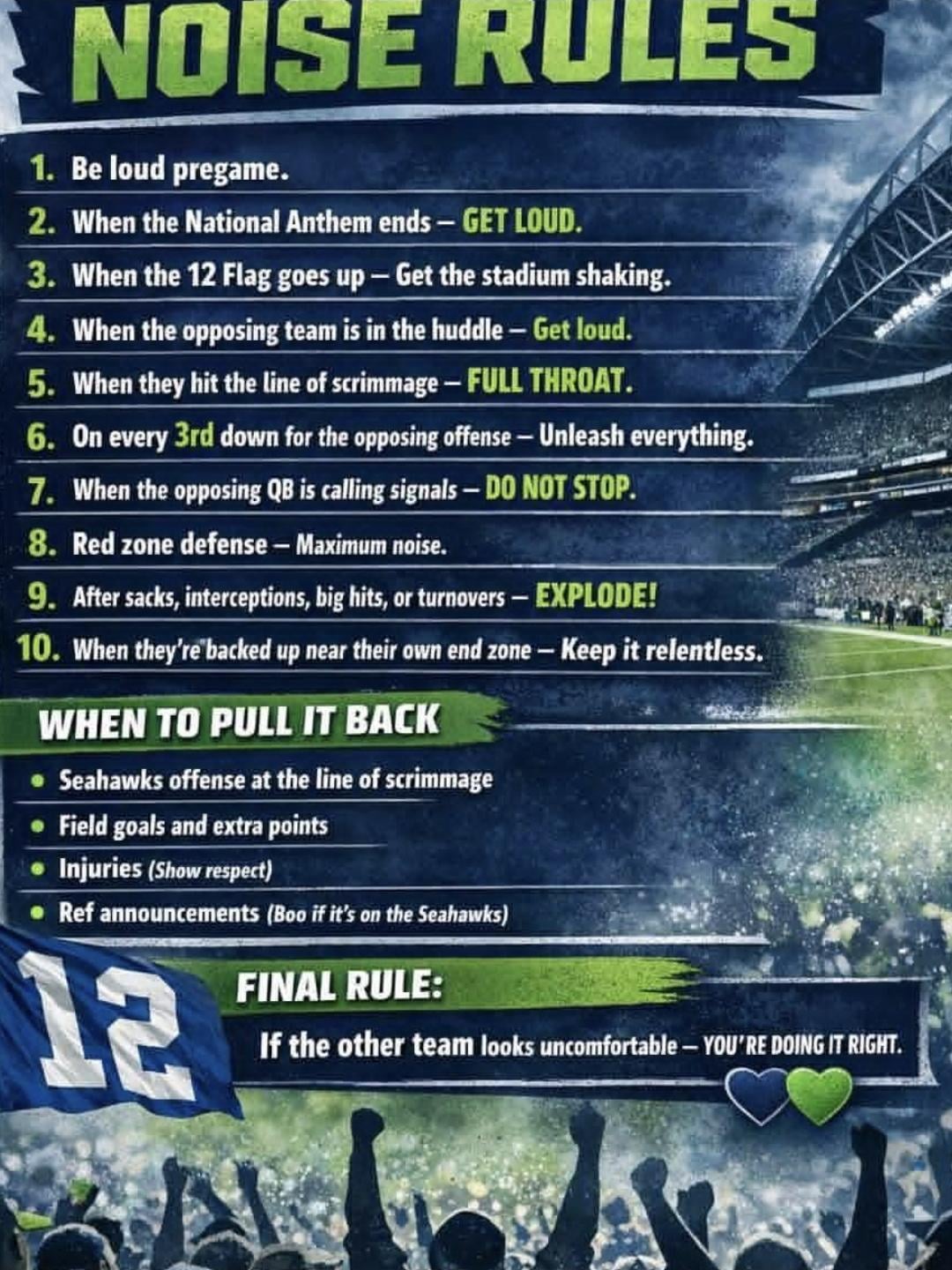 Maximum noise should be when the opposing offense is calling an audible or close to snapping the ball , it hurts their offense and it really revs up the Seahawks defense