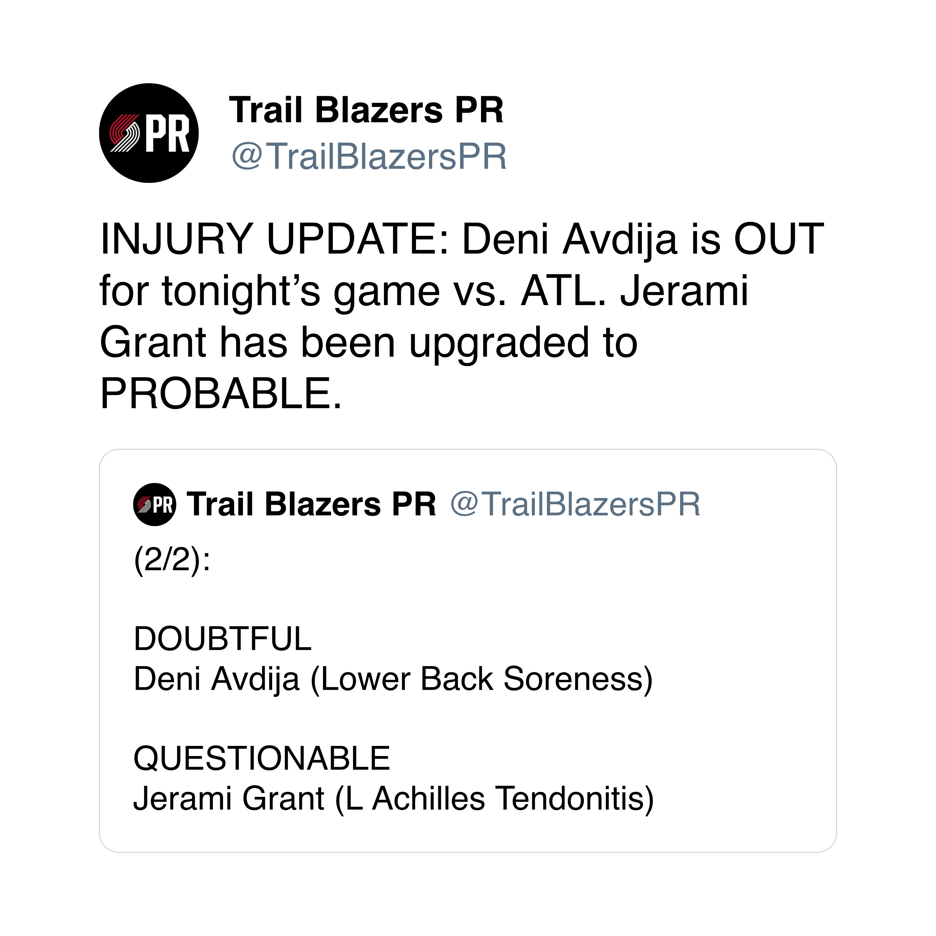 INJURY UPDATE: Deni Avdija is OUT for tonight’s game vs. ATL. Jerami Grant has been upgraded to PROBABLE.