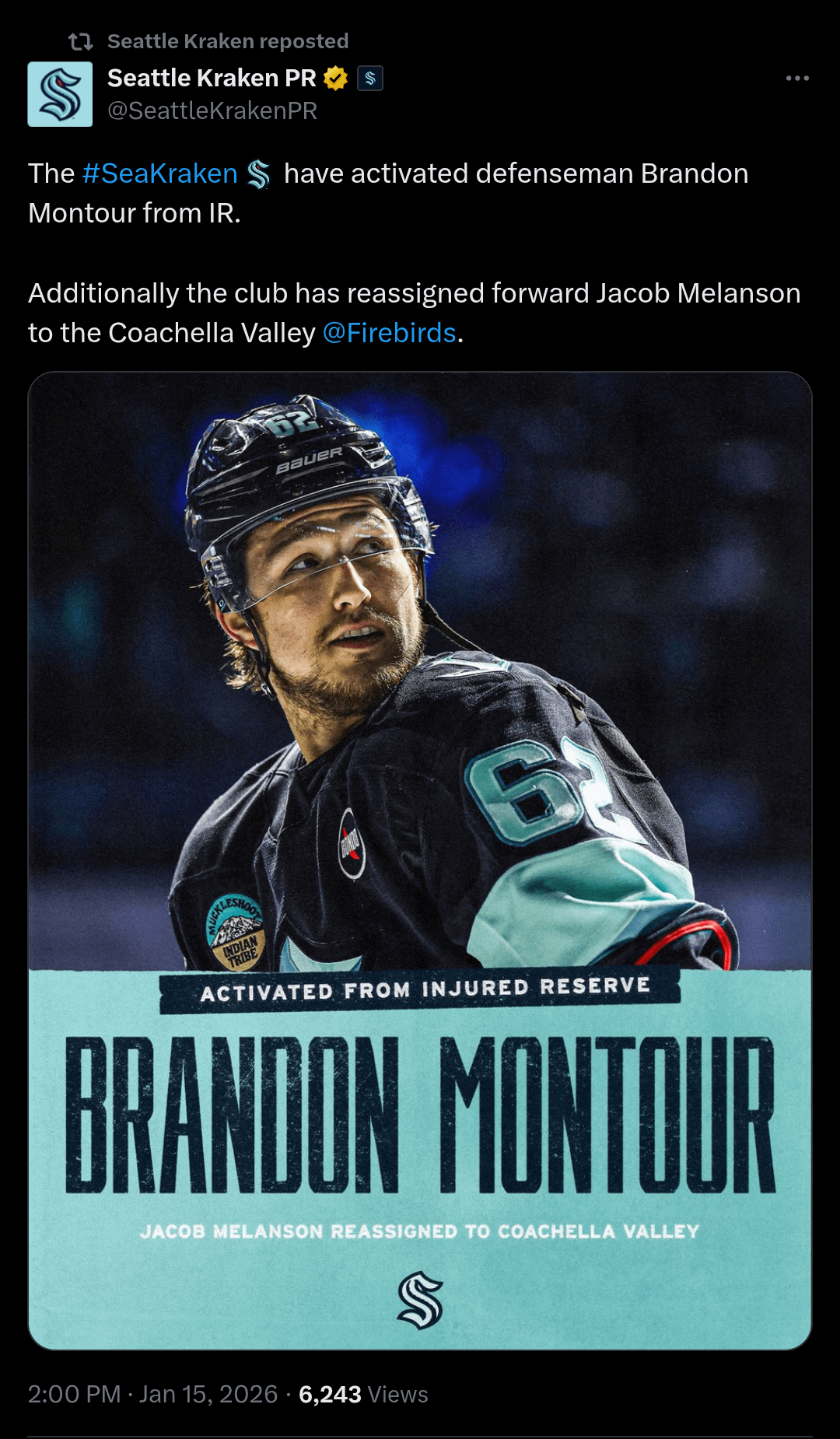 [Twitter] Montour activated from IR, Melanson to Coachella