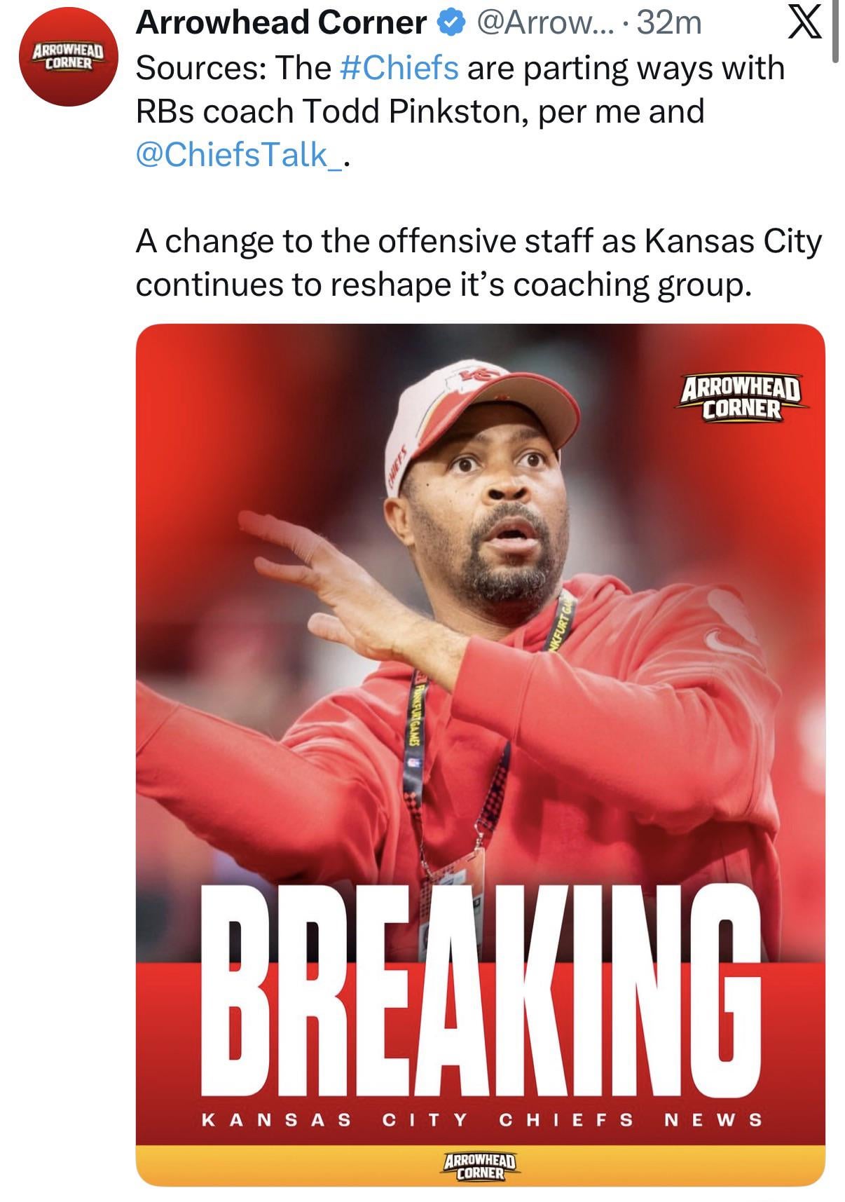 [Arrowhead Corner] Sources: The #Chiefs are parting ways with RBs coach Todd Pinkston, per me and @ChiefsTalk_. A change to the offensive staff as Kansas City continues to reshape it’s coaching group.