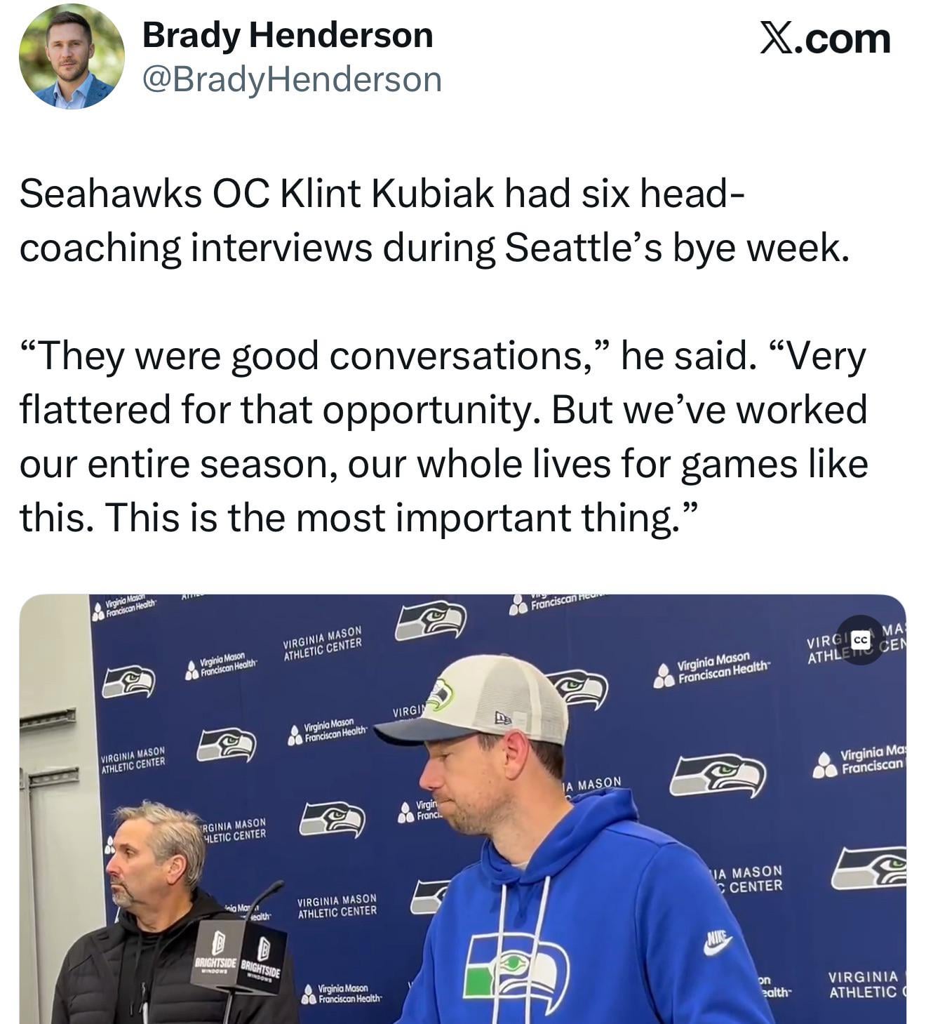 I think his post-season performance with the Seahawks translates to even more pay if he leaves for a HC job. I’m not worried at all about this getting in the way of the post season