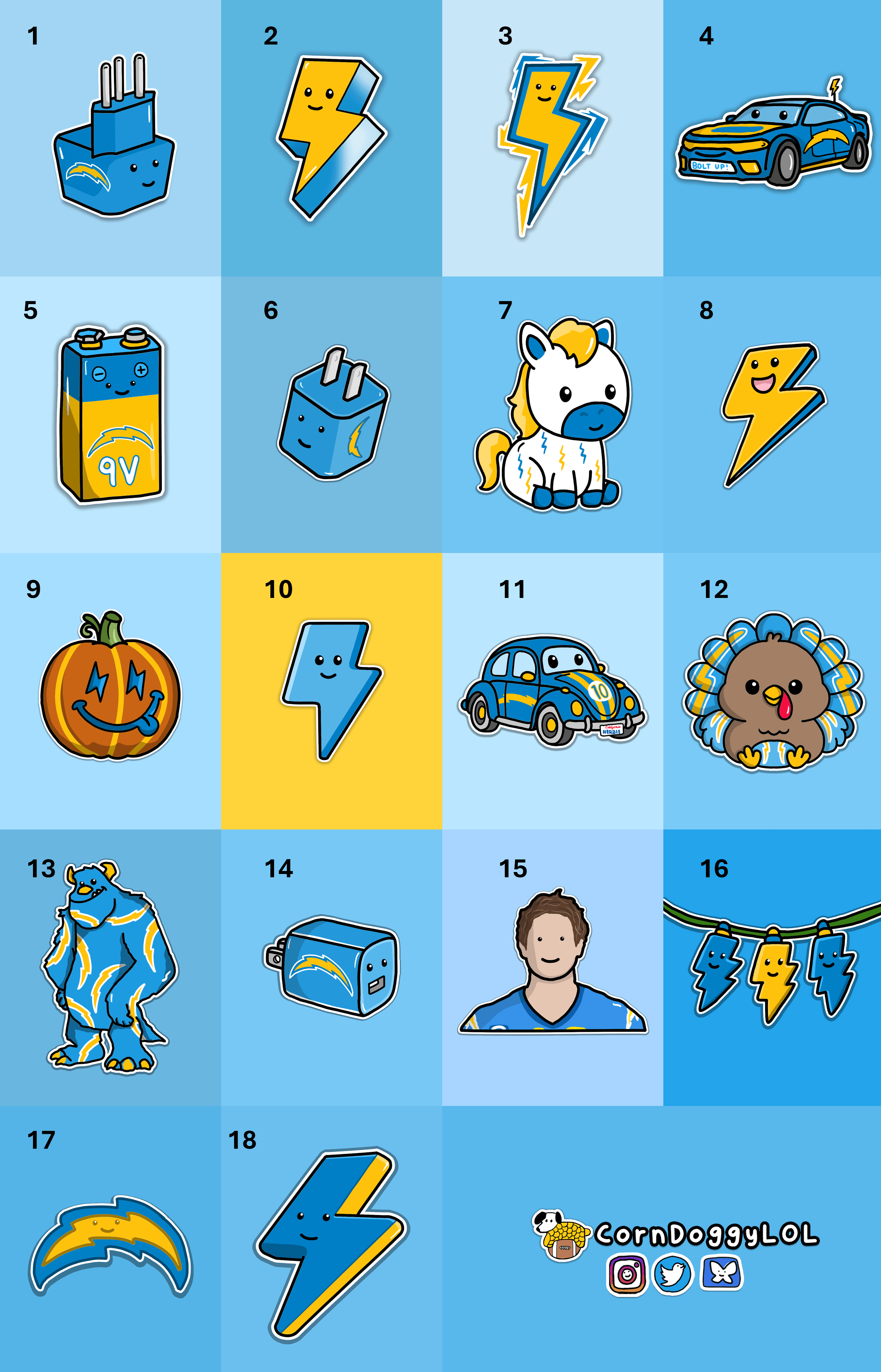 My 2025 Los Angeles Chargers Doodles π Do you have a favorite? 23 comments 8 heβs a happy little bolt 3 heβs vibinβ 1, 6, and 14 obviously Number 11 easily I love 8 and 9 15 π₯° Always partial to the plugs but appreciate that you find ways to switch it up throughout the season! Edit: Also did not realize you had the whole team schedules and depth charts from the start of the year on the site. Very cool! I appreciate all of these π Yes Sully easily 4, 9, 11 the fact that week one is a Brazil compatible charger is just GENIUS adorable all around but 6 especially is just a lil guy 11 8 is just happy to be here None of us golfing I like 7 I truly love all of them, but if Iβm forced to pick, itβs #11 Herbie the Love Bug 7, 11, and 15. π 7! I like that it combines the OG Charger battle horse with bolts 11 & 12 are my favorites These are great. Can you make one that is 15 but has a face of utter despair? 1, 13, 15π©΅π Week 15 is so cute. Also 7. Number 11 Herbie the love bug Leave a ReplyYou must be logged in to post a comment.