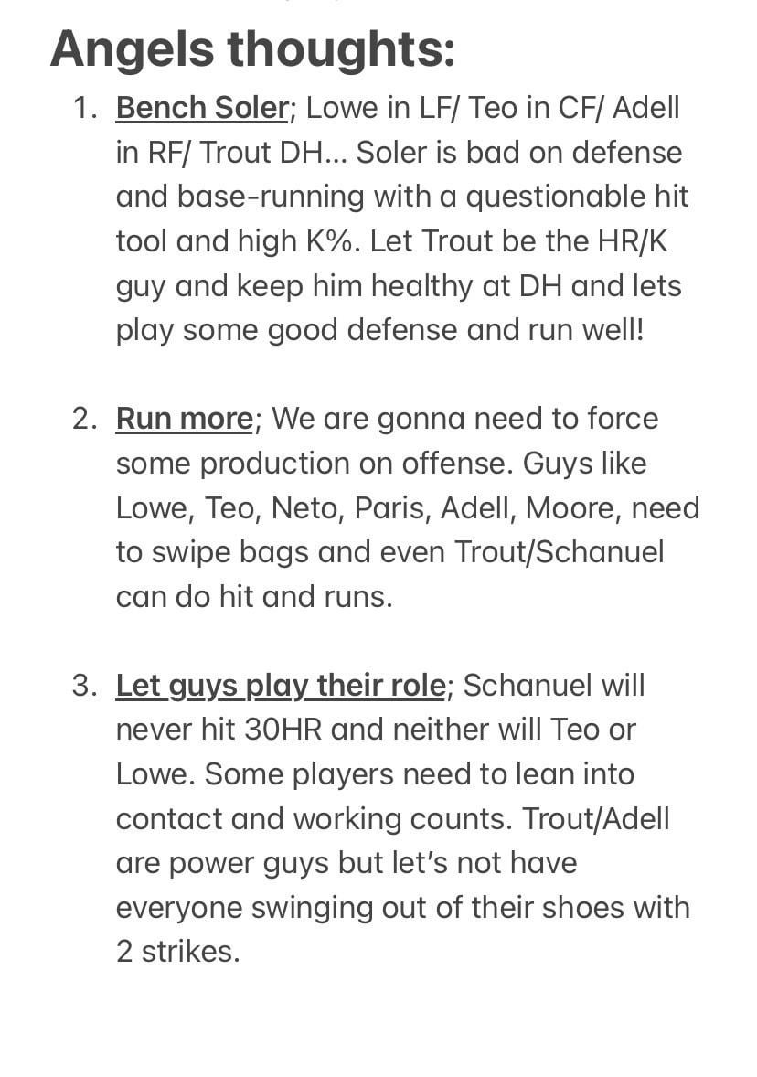 They have to start Soler. Teo can’t start with how bad his bat is, it’s literally a black hole. Soler put up an .850 ops just 2 years ago. I think Lowe could play a serviceable CF, they should put Adell in RF where he plays great defense, and Trout/Soler can be in LF. Teo can sub in late in the game in CF, to move Lowe to LF.