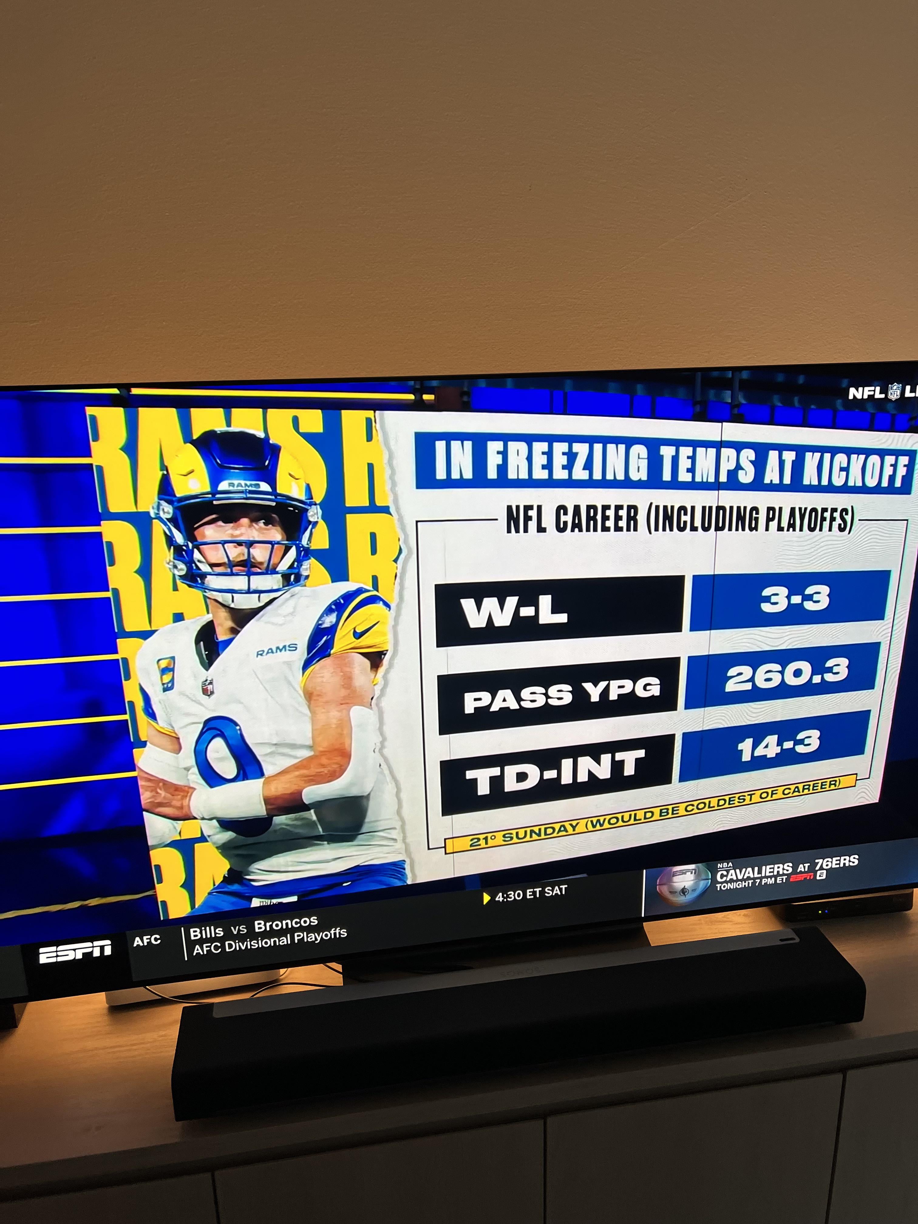 his record in cold weather is way exaggerated. the fact is these games are road games and chances are if ur playing a road game … ur playing a superior team (bc such team had a better record in the reg season due to being superior … yeah shocking). and therefore why his record is 3-3.