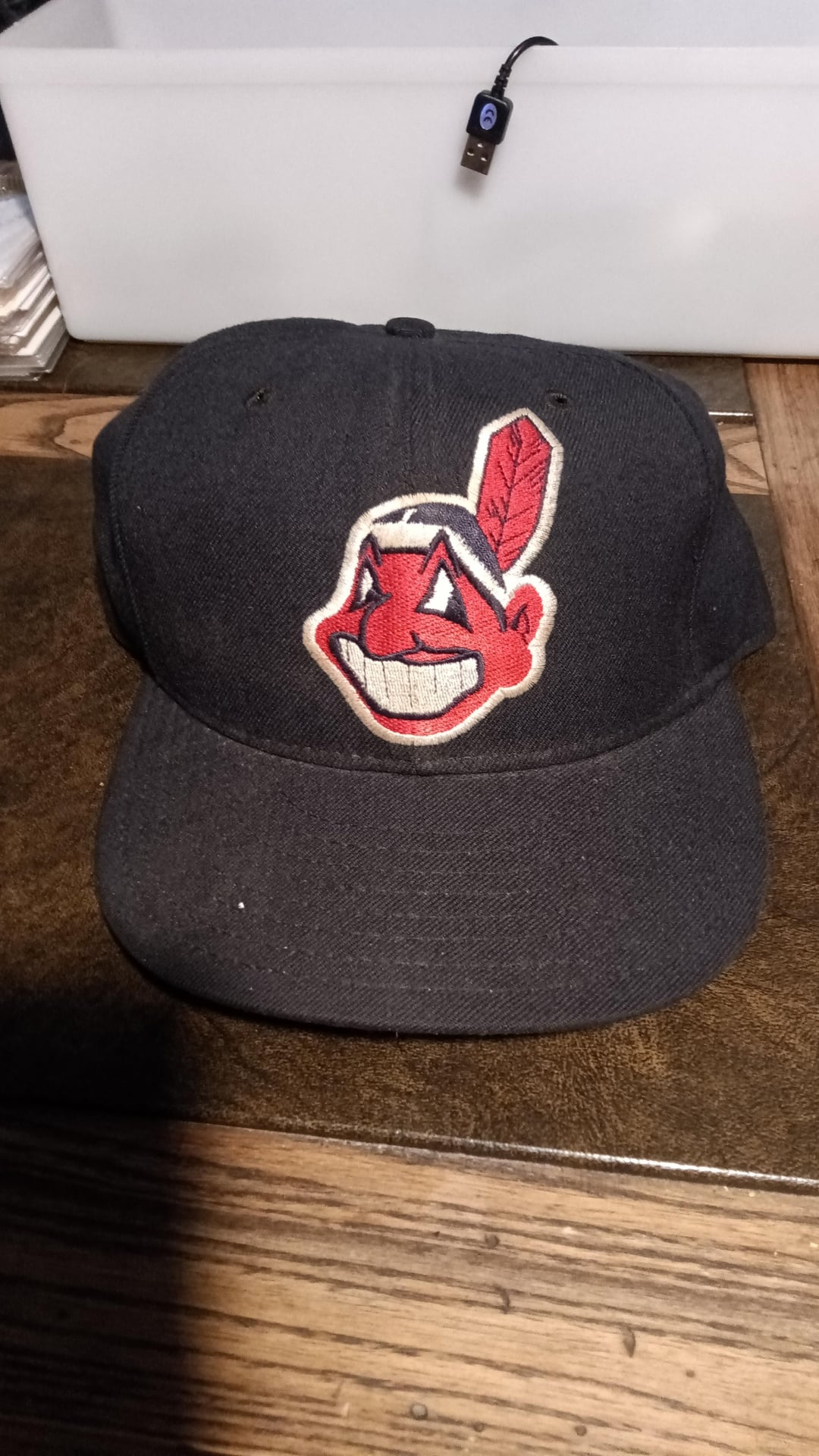 This is the flatter/less textured wahoo hat logo that I believe may have been last worn in 1998. Around 1999 the wahoo logo on the hat was updated with more depth in the stitching.