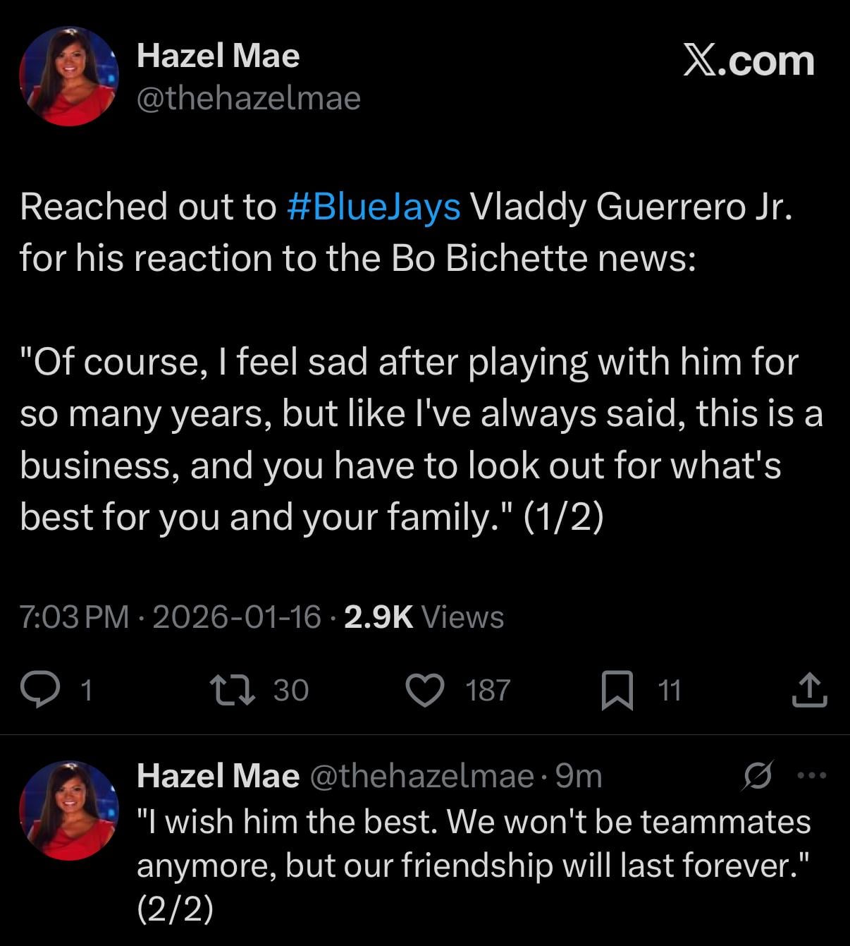 [Mae] Vladdy’s reaction to Bo: “Of course, I feel sad after playing with him for so many years, but like I’ve always said, this is a business, and you have to look out for what’s best for you and your family. I wish him the best. We won’t be teammates anymore, but our friendship will last forever.”