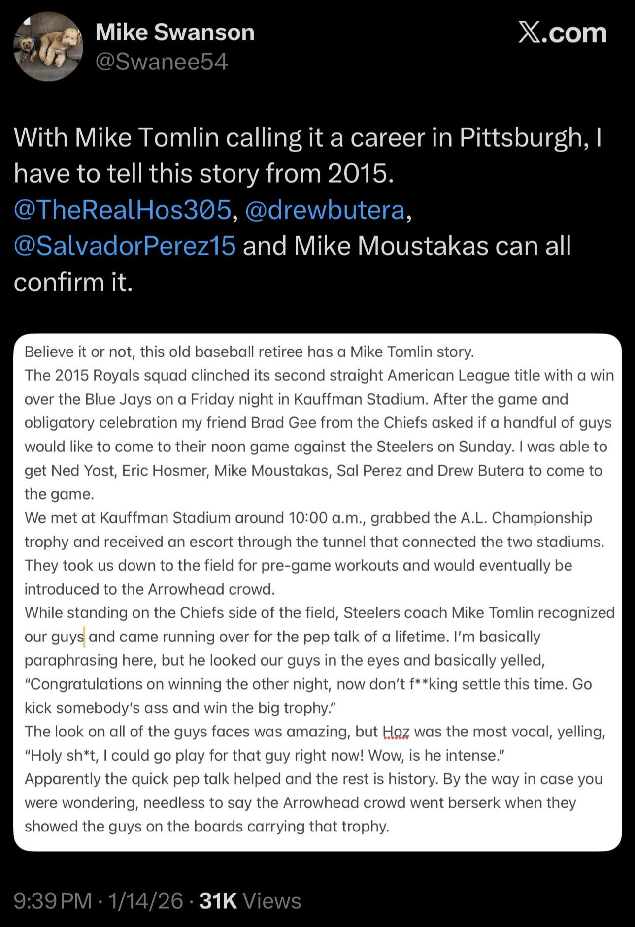 [Mike Swanson] With Mike Tomlin calling it a career in Pittsburgh, I have to tell this story from 2015. @TheRealHos305, @drewbutera, @SalvadorPerez15 and Mike Moustakas can all confirm it.