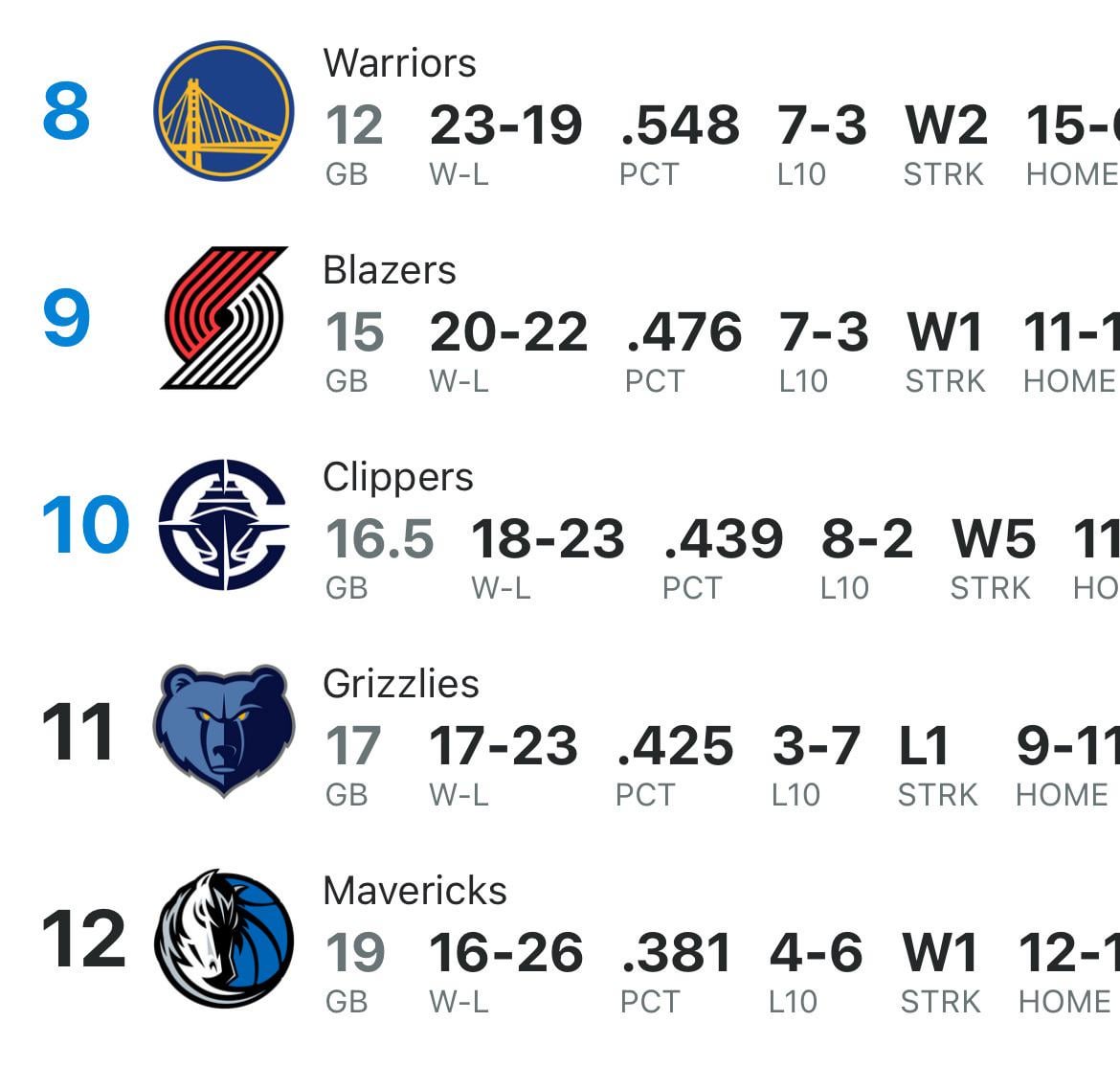 With the Clippers win tonight the Grizzlies have fallen to the 11th seed at the halfway mark
