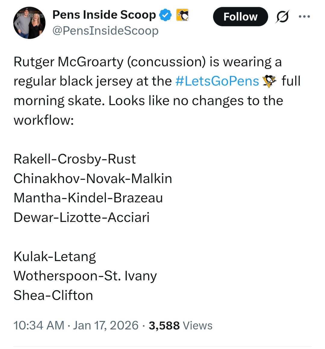 Rutger will get in lineup…we have 12 forwards…one will almost always be injured or needing of rest…We are fortunate to have healthy bodies atm