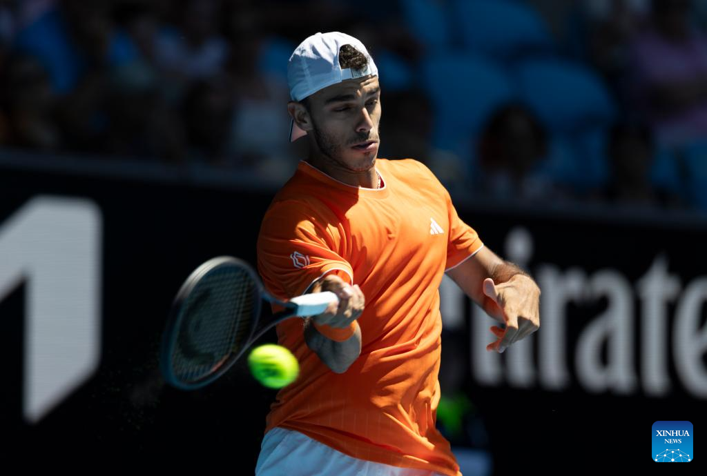 Francisco Cerundolo of Argentina hits a return during the men’s singles first round match between Zhang Zhizhen of China and Francisco Cerundolo of Argentina at the Australian Open tennis tournament 2026 in Melbourne, Australia, Jan. 18, 2026. (Photo by Hu Jingchen/Xinhua)