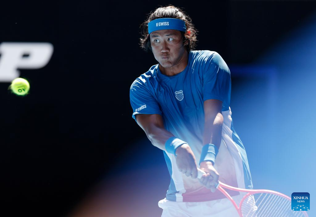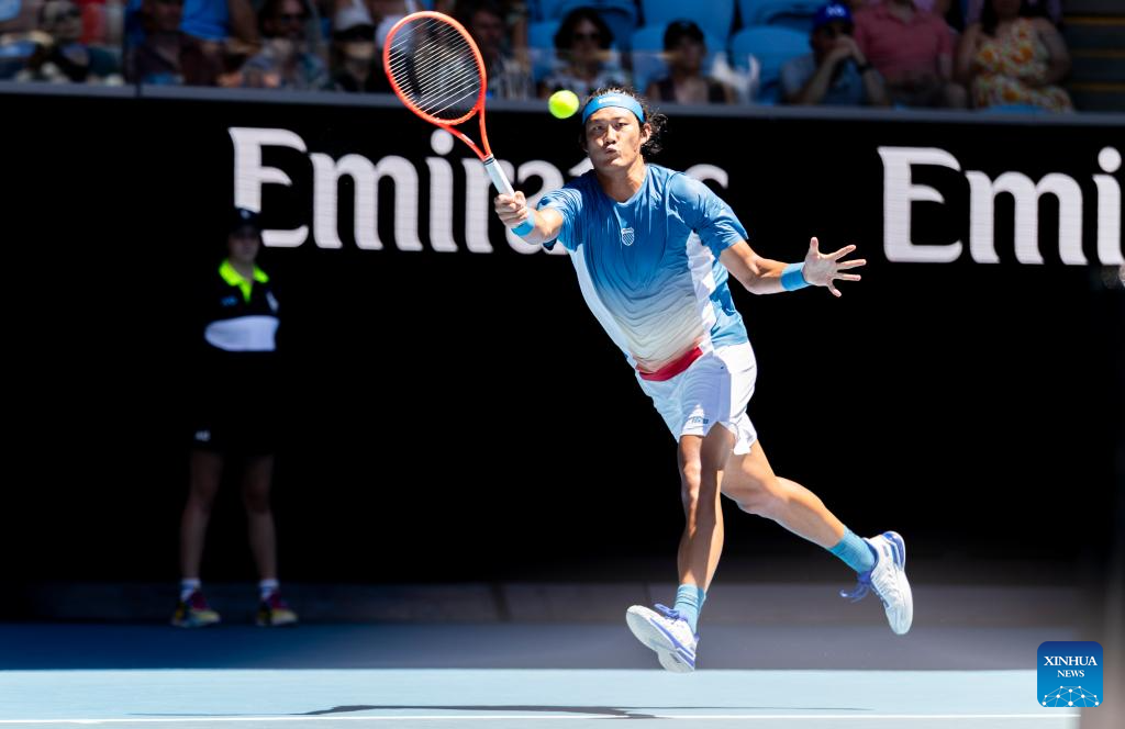 Zhang Zhizhen of China hits a return during the men’s singles first round match between Zhang Zhizhen of China and Francisco Cerundolo of Argentina at the Australian Open tennis tournament 2026 in Melbourne, Australia, Jan. 18, 2026. (Xinhua/Ma Ping)