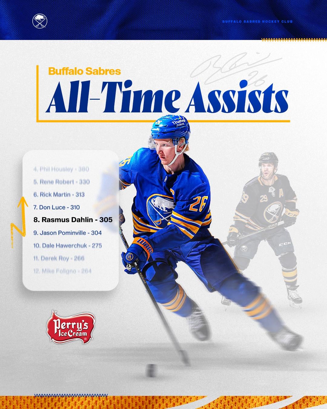 Dahlin is now #8 all time for assists on the Sabres 1 comment 1. Gilbert Perreault 814 2. Dave Andreychuk 436 3. Craig Ramsay 420 For anyone else wondering who the graphic cut off. Leave a ReplyYou must be logged in to post a comment.