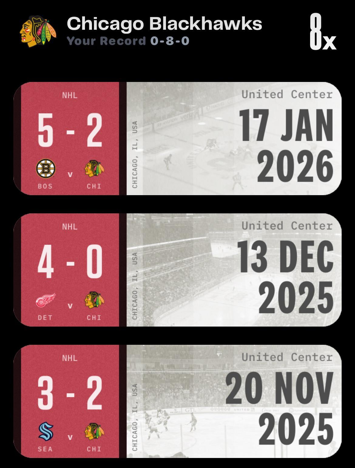I should just stop atp 😠11 comments Oof I assume they are games that you have attended. If so, you are now banned from entering the United Center I think they lost 11 in a row that I attended last season. I went from March 2024-March 2025 without seeing a win. I feel your pain. Maybe you should go to some Avalanche games instead. What app is this? I’ve seen them 12x in my life and I’ve never seen them win.  Every time I have seen the Blackhawks, the other team has scored 5 goals. Dec 23, 2001 DET 5 – CHI 0 March 30, 2023 STL 5 – CHI 3 April 1, 2023 NJD 5 – CHI 3 Everyone in this thread is banned; we’re trying to be contenders again. Do you expect anything else from this team? They have been terrible for the last 7 years… I haven’t seen a win in person since 2019. Obviously I don’t go to that many, about one or two a season, but still. Leave a ReplyYou must be logged in to post a comment.