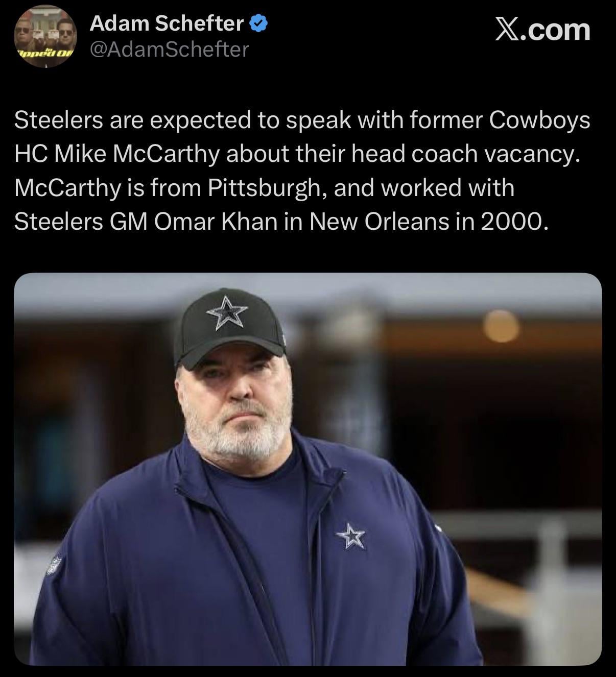 Steelers are expected to speak with former Cowboys HC Mike McCarthy about their head coach vacancy. McCarthy is from Pittsburgh, and worked with Steelers GM Omar Khan in New Orleans in 2000.