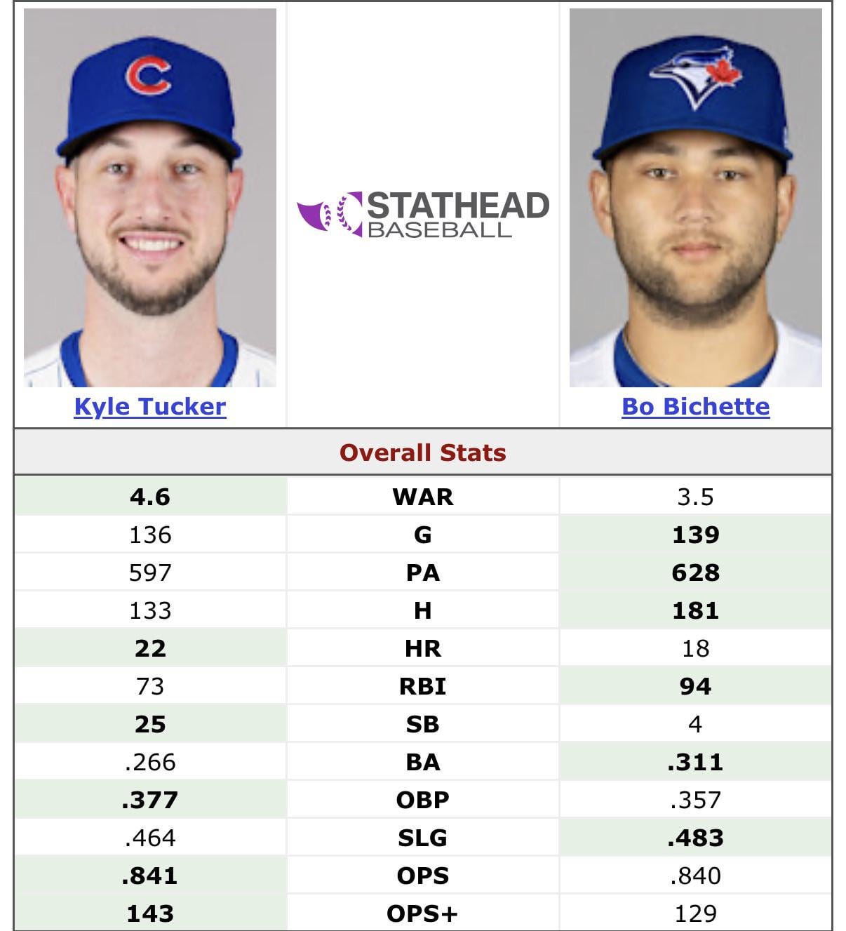 The biggest difference no is mentioning is Kyle Tucker would have been filling an essentially vacant spot on the outfield right now whereas Bo is likely going to displace Baty, who actually has almost exactly the same bWAR as Bo over the last two seasons (really you can look it up I’m not kidding)