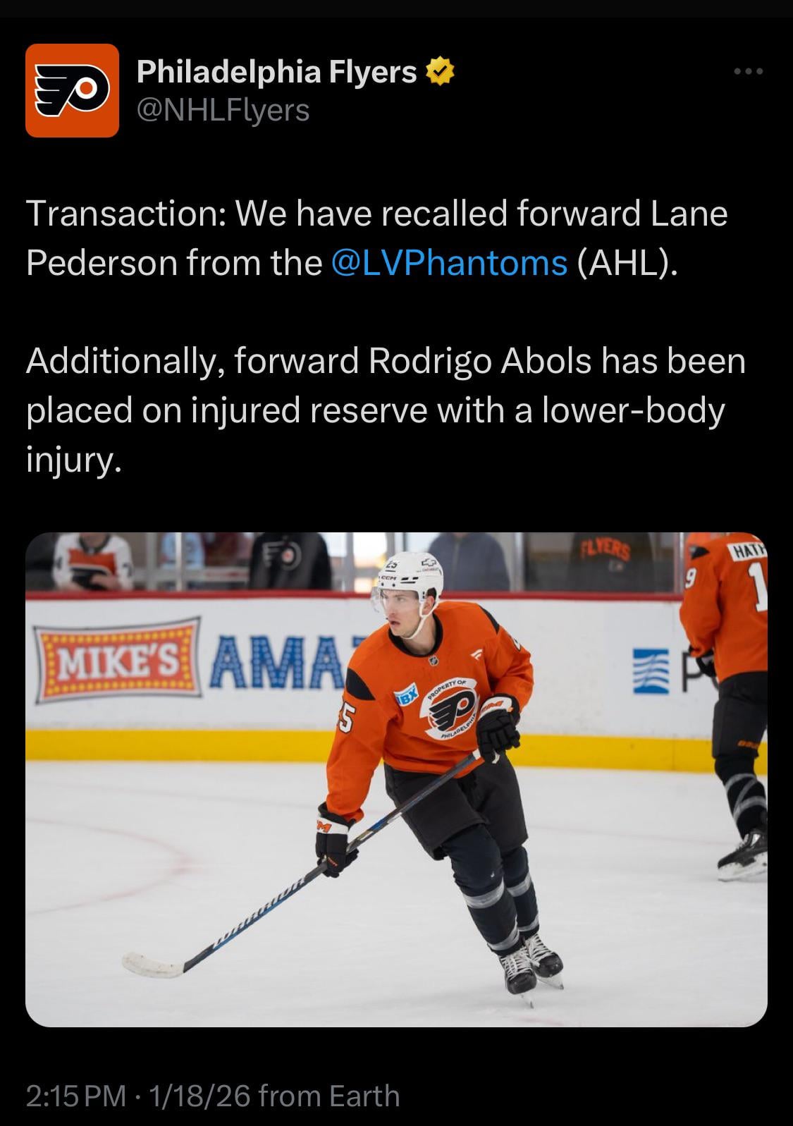 [Flyer] Transaction: We have recalled forward Lane Pederson from the LVPhantoms(AHL). Additionally, forward Rodrigo Abols has been placed on injured reserve with a lower-body injury.