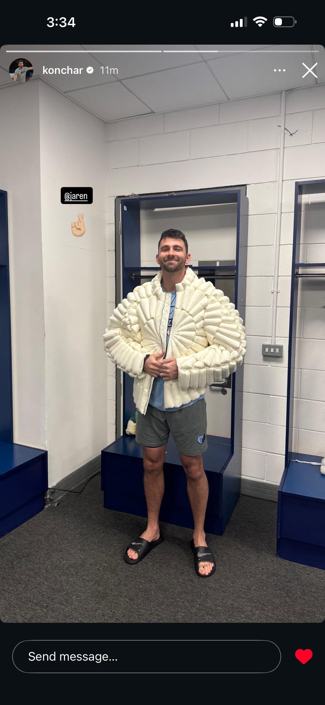 But Konchar’s daring combination with black flip flops and jit-color shorts displays his unique and personal *casual blue-collar* style of fashion.