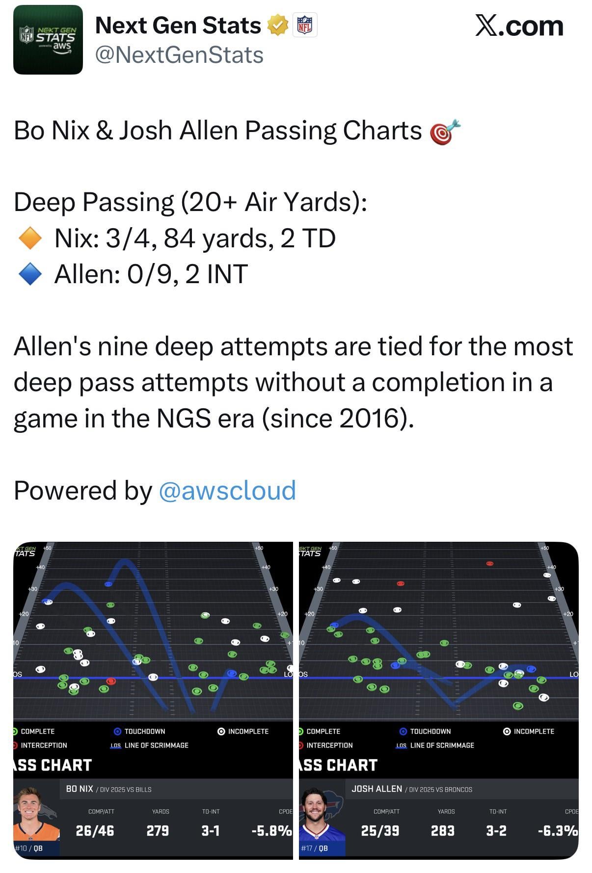 [Next Gen Stats] Bo Nix & Josh Allen Passing Charts. Deep Passing (20+ Air Yards): Nix: 3/4, 84 yards, 2 TD, Allen: 0/9, 2 INT. Allen’s nine deep attempts are tied for the most deep pass attempts without a completion in a game in the NGS era (since 2016).