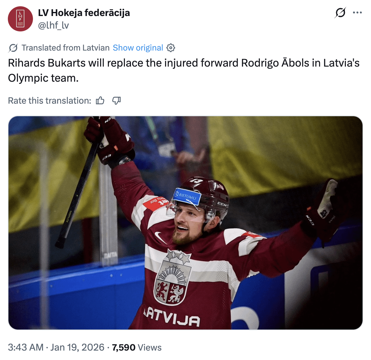 [Latvian Ice Hockey Federation] Rihards Bukarts will replace the injured forward Rodrigo Ābols in Latvia’s Olympic team.