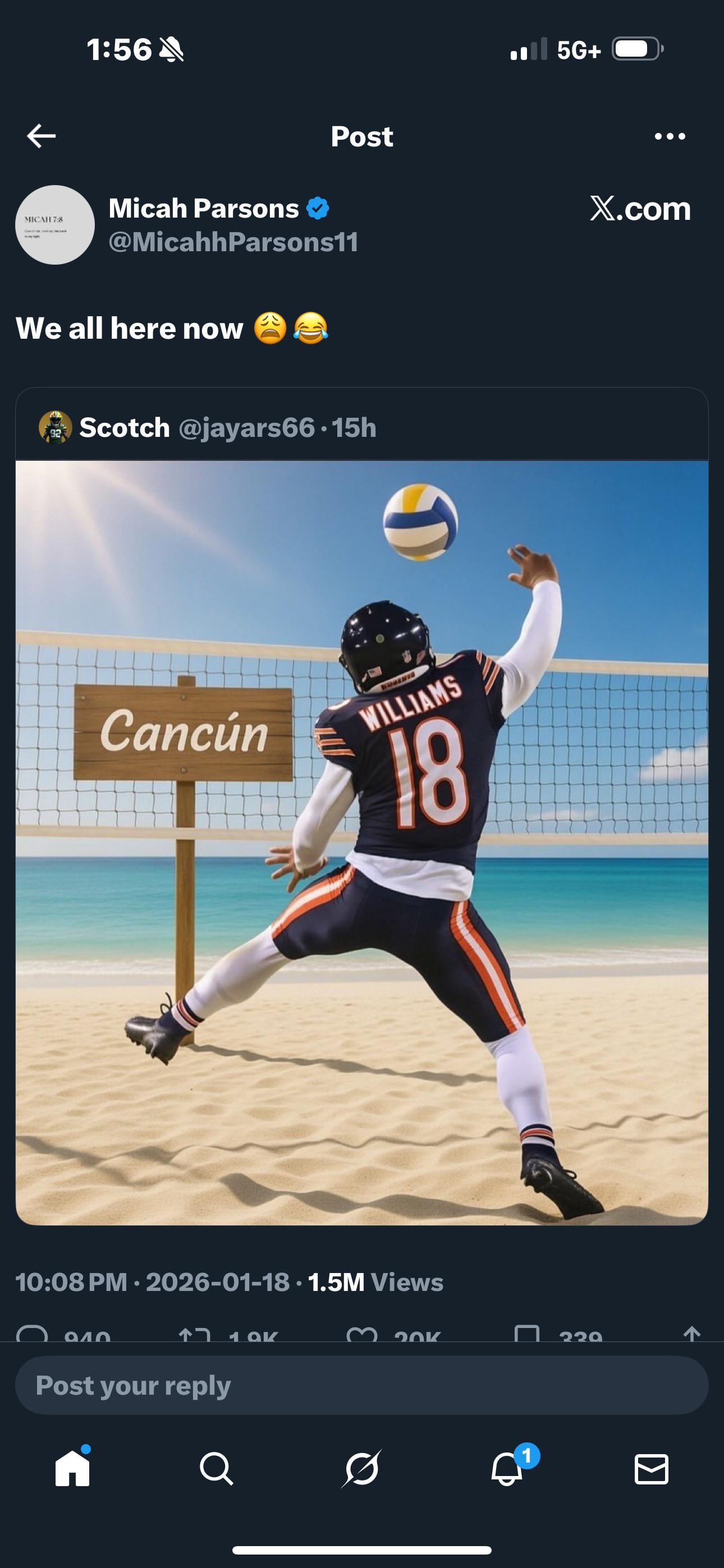 Thats funny! Im in Cancun right now, last night the sports bar at the resort was packed full of Bear fans. Very enjoyable watching them lose their shit as the game slipped away in overtime.