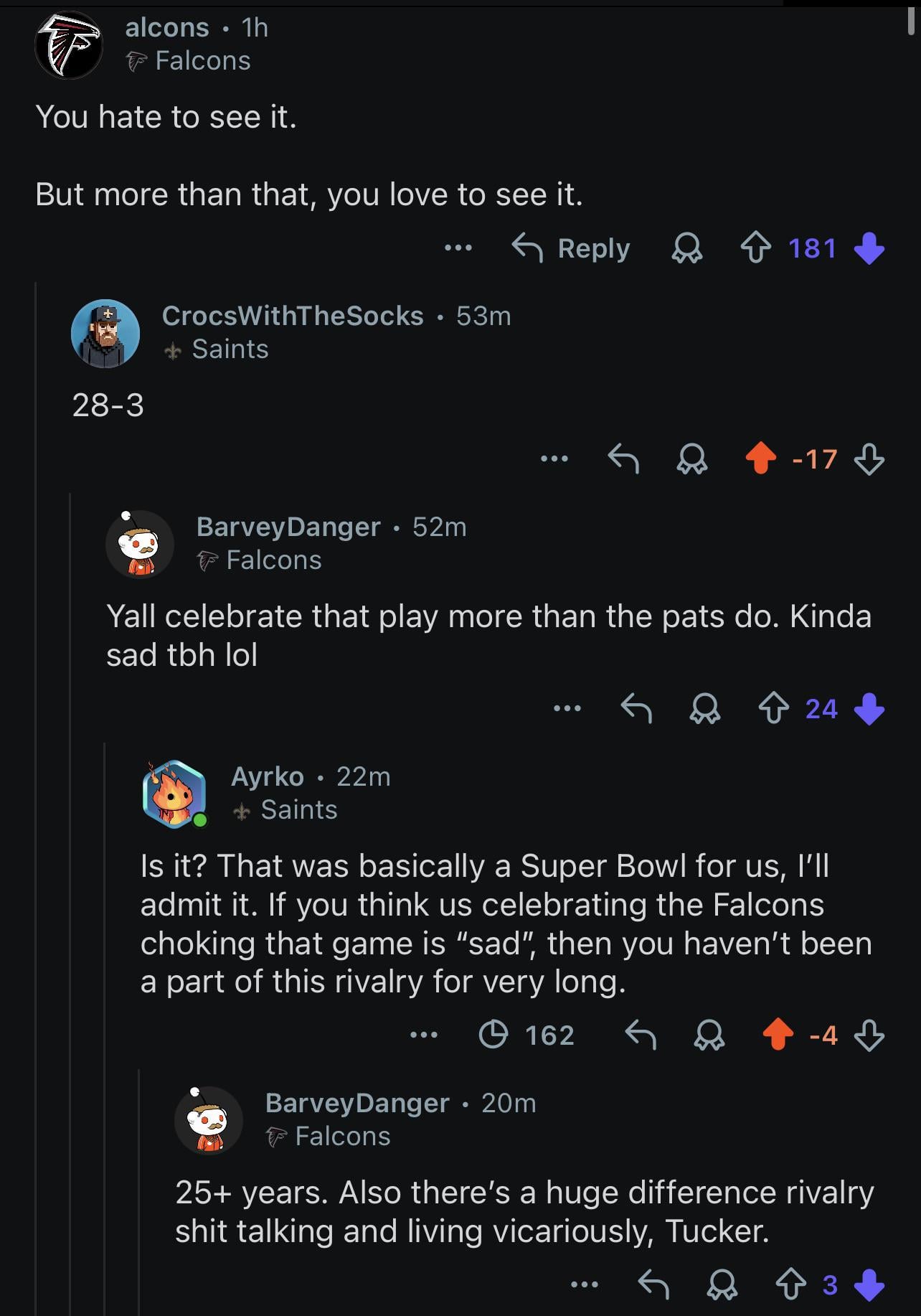 Any Saints playoff heartbreak post on /r/nfl is just a circlejerk thread by Falcons and Vikings fans.
