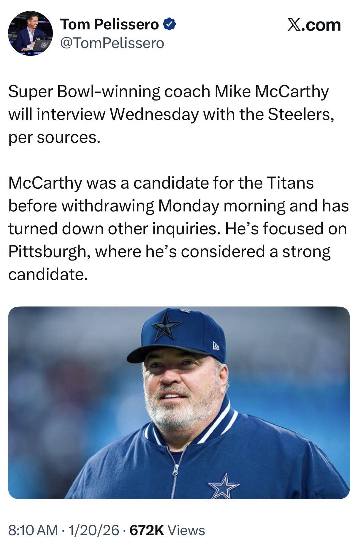 [Pelissero] Super Bowl-winning coach Mike McCarthy will interview Wednesday with the Steelers, per sources. McCarthy was a candidate for the Titans before withdrawing Monday morning and has turned down other inquiries. He’s focused on Pittsburgh, where he’s considered a strong candidate.