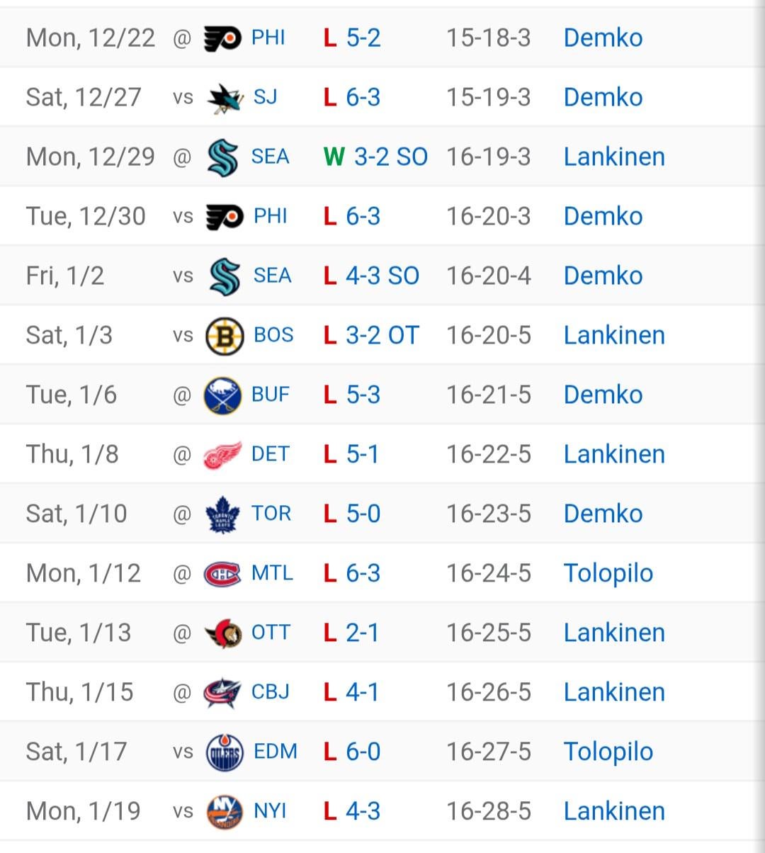8. Forgot our last win was a shootout so basically a tie. Been a loooong time since we’ve had a regulation win!