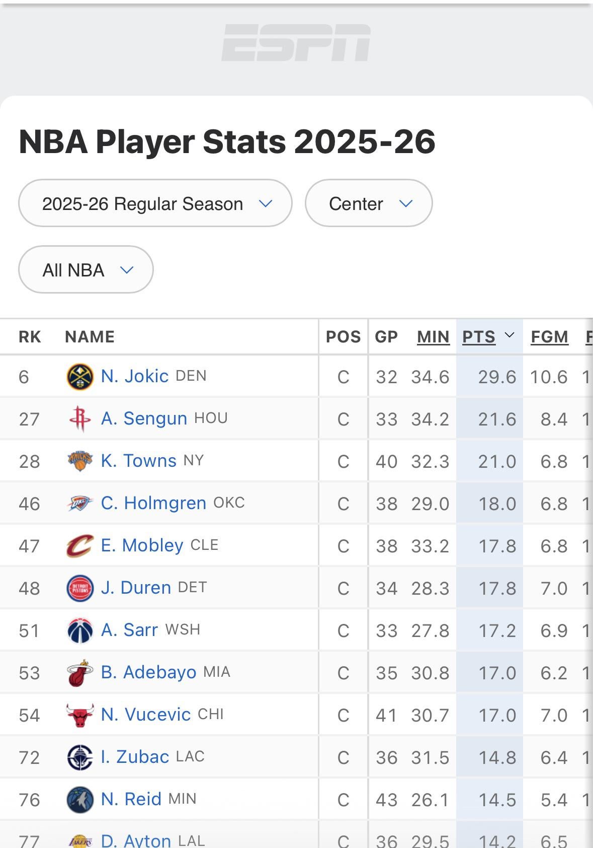 Alpi is the only player in the NBA who leads his team in rebounds, assists, and steals, and he is also one of only three players who lead their team in both rebounds and assists. He was averaging 24 points, 10 rebounds, and 7 assists for the entire season. Even after the injury, despite the drop in his stats, he is still averaging 21.6 points, 9.2 rebounds, and 6.4 assists. Until he got injured, he had been in the MVP rankings for 10 straight weeks. The Rockets were also one of the top six teams in the NBA, I’m sharing his stats among all big men. If we include Wemby, he would rank 3rd.